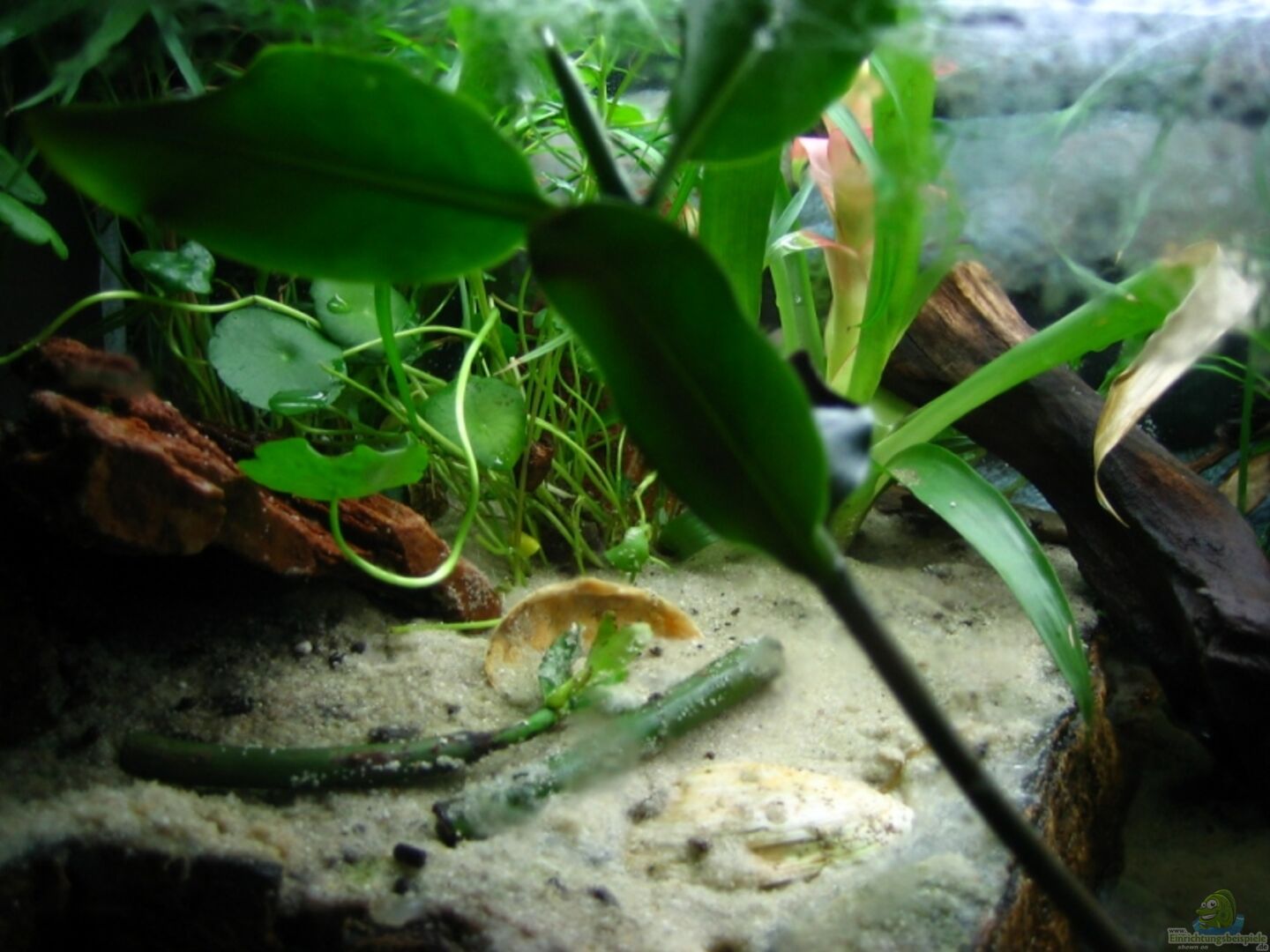 In der linken Seite des Beckens habe ich einen Landteil aus mit Silikon verklebten Juwel ´Rock´ Strukturrückwandteilen aufgebaut. Dieser ist zu 2/3 mit einem Gemisch aus Sand und Blumenerde gefüllt, und zu 1/3 mit normalem Sand.