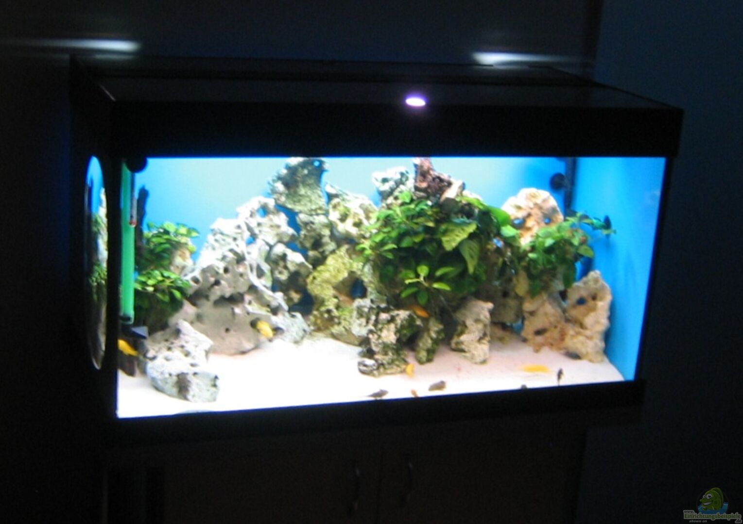 Juwel Aquariumdeckel mit Edelstahlklappen Unterschrank ist Eigenbau mit 18 mm Multiplexplatte für Korpus und 40 mm Multiplexplatte für Auflage (geölt). Seiten-und Heckscheibe mit blauer Folie beklebt; auf der linken Seite zusätzlich ein Edelstahlblech mit Ausschnitt aufgeklebt