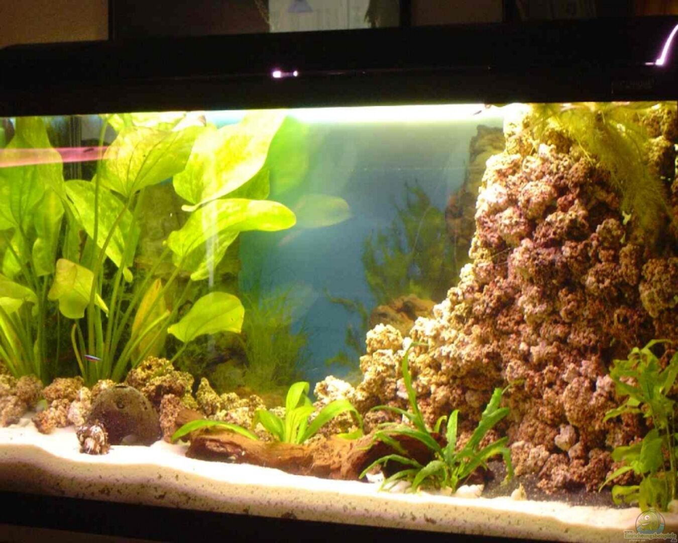 Selbstgebautes Riff aus Aqua Terra Steinen und Plexiglas.Carbo Plus, Stabheizer und Ansaugung wurden dahinter versteckt. 2 Kies / Sandarten durch verklebte Plexiglastrennung auseinandergehalten damit sie sich nicht zu stark vermischen. Unterschrank ist vom Möbel Hofmeister und wurde komplett umgebaut mit Massivholz und Metallwinkel. Die obere Betonverschalungsplatte wurde mit einer weissen Folie bezogen damit es zum Schrank passt.Filter, Zeitschaltuhren, das Carbo Plus Steuergerät, eine Tetra UV-C400 [...]