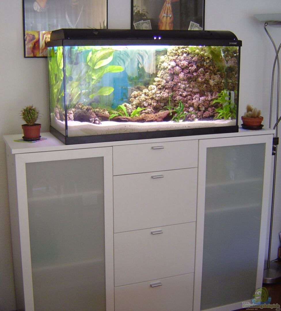 Selbstgebautes Riff aus Aqua Terra Steinen und Plexiglas.Carbo Plus, Stabheizer und Ansaugung wurden dahinter versteckt. 2 Kies / Sandarten durch verklebte Plexiglastrennung auseinandergehalten damit sie sich nicht zu stark vermischen. Unterschrank ist vom Möbel Hofmeister und wurde komplett umgebaut mit Massivholz und Metallwinkel. Die obere Betonverschalungsplatte wurde mit einer weissen Folie bezogen damit es zum Schrank passt.Filter, Zeitschaltuhren, das Carbo Plus Steuergerät, eine Tetra UV-C400 [...]