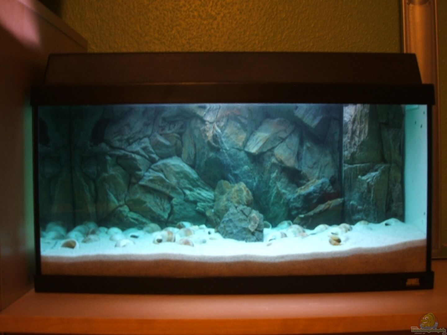 Becken mit Kiesblende Rückwand (Diese hat aber nur im oberen Bereich eine Tiefe von 6cm, im unteren Bereich bis 2/3 Beckenhöhe ist sie nur 1, 5cm dick und nimmt nicht viel Schwimmraum und Grundfläche in Anspruch. Da die Beckengrundfläche bei den Neolamprologus multifasciatus wichtiger als die Beckenhöhe ist, habe ich mich für diese Rückwand entschieden.)