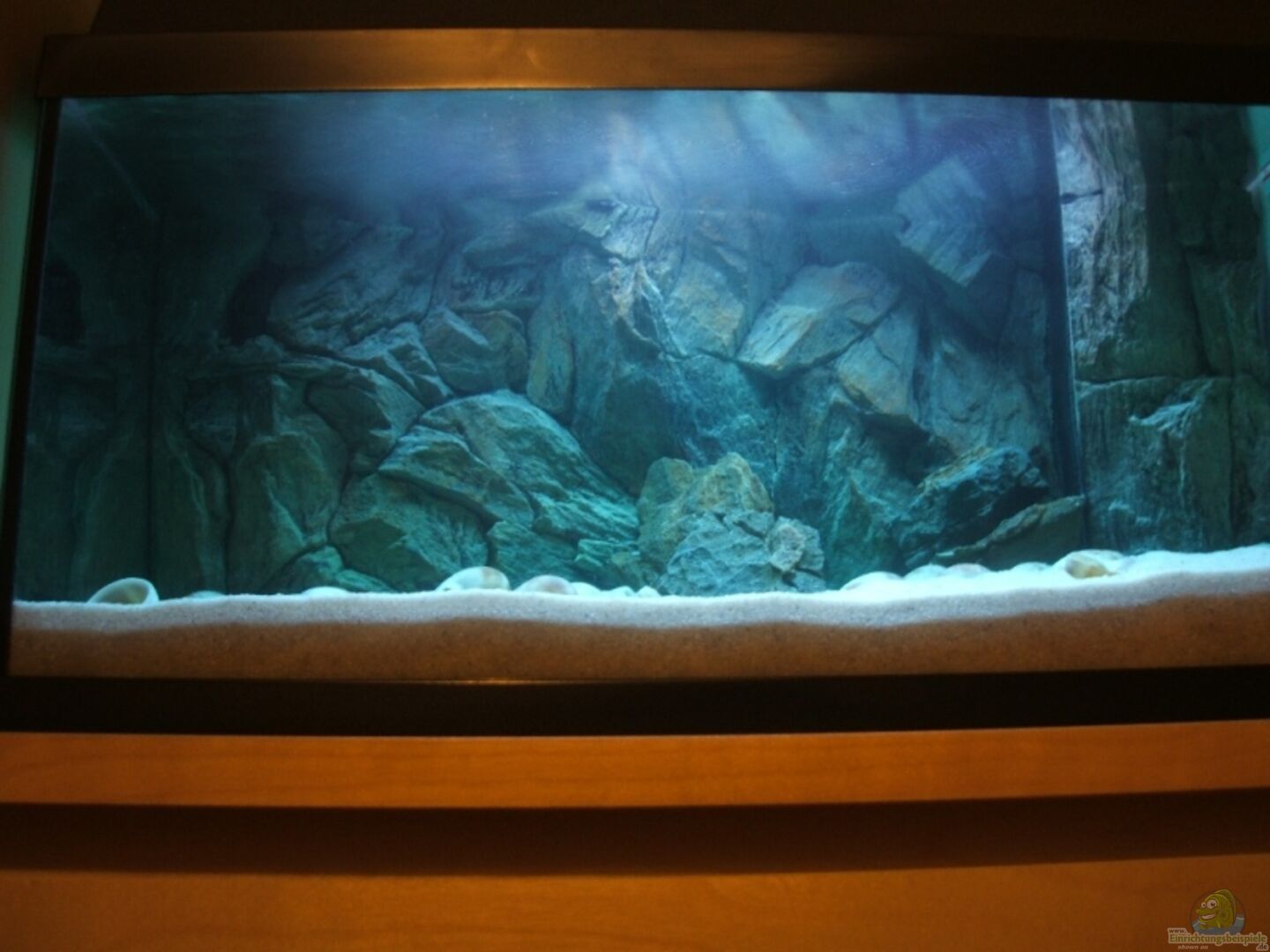 Becken mit Kiesblende Rückwand (Diese hat aber nur im oberen Bereich eine Tiefe von 6cm, im unteren Bereich bis 2/3 Beckenhöhe ist sie nur 1, 5cm dick und nimmt nicht viel Schwimmraum und Grundfläche in Anspruch. Da die Beckengrundfläche bei den Neolamprologus multifasciatus wichtiger als die Beckenhöhe ist, habe ich mich für diese Rückwand entschieden.)