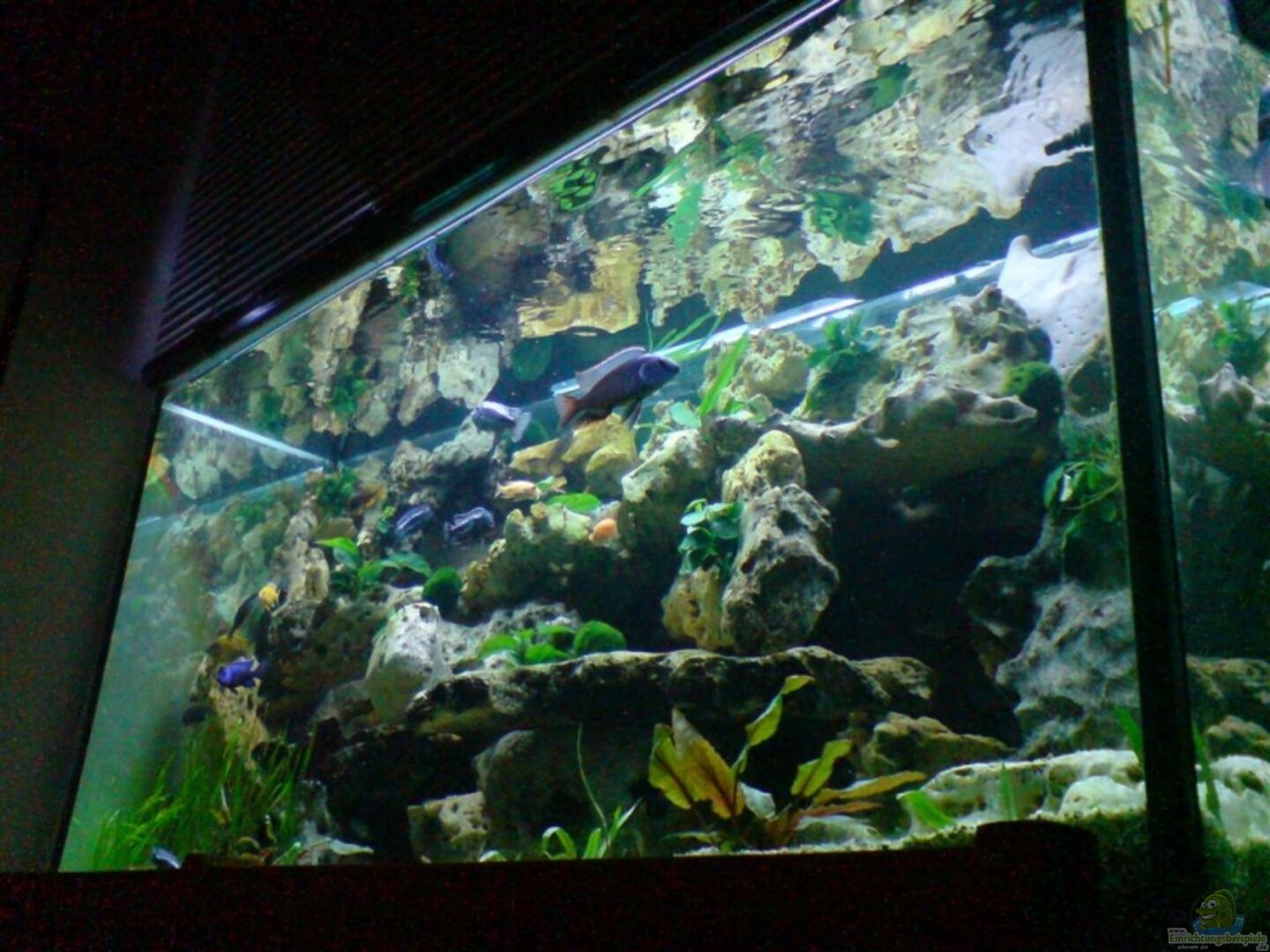 Sto??verklebt, Eigenbau, Glasstärke 2 cm, Das Becken steht auf einer selbst gemauerten Y.Tong Vorrichtung, die mit wei??em Furnier verkleidet ist. Das Becken selbst steht auf einer 5 cm dicken Styroporplatte. Die 3 Au??enfilter befinden sich in den Unterschränken. Im Becken ist eine Rückwand mit Malawi-optik eingepa??t. Nicht verklebt. Fische können n i c h t dahinter schwimmen!!!!