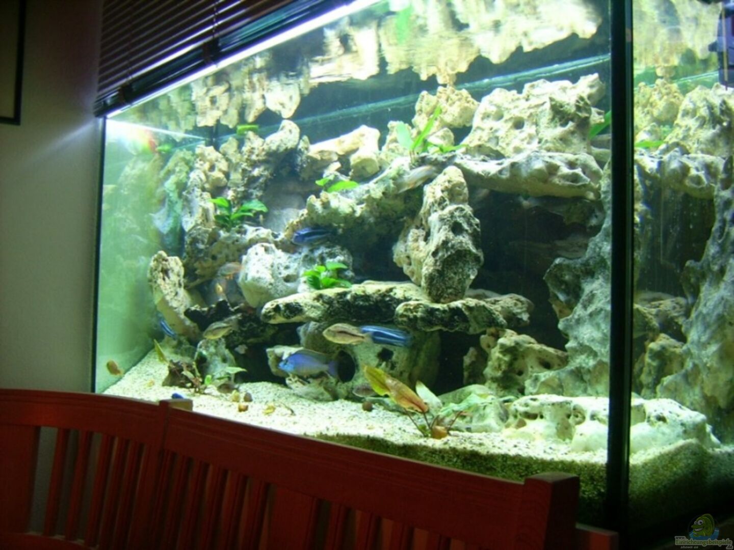 Sto??verklebt, Eigenbau, Glasstärke 2 cm, Das Becken steht auf einer selbst gemauerten Y.Tong Vorrichtung, die mit wei??em Furnier verkleidet ist. Das Becken selbst steht auf einer 5 cm dicken Styroporplatte. Die 3 Au??enfilter befinden sich in den Unterschränken. Im Becken ist eine Rückwand mit Malawi-optik eingepa??t. Nicht verklebt. Fische können n i c h t dahinter schwimmen!!!!