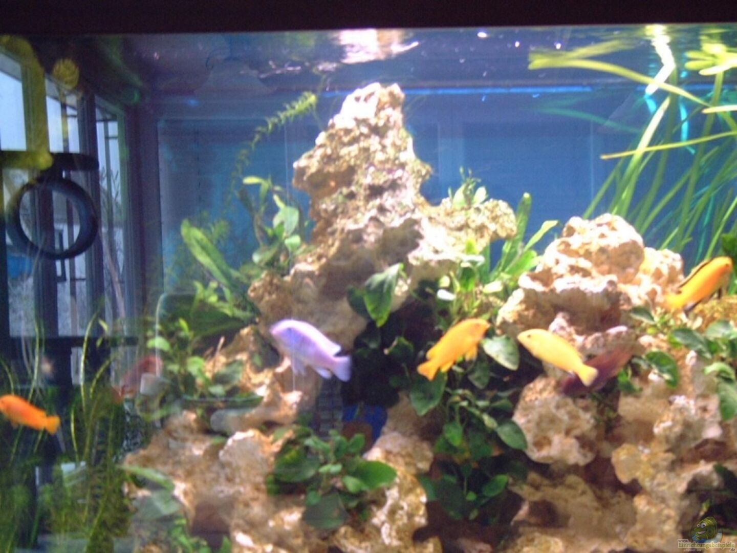Glasbecken 12 mm Sto??verklebt und Abdeckung mit T5 Balken für 2x24 W wurden im Auftrag hergestellt. Das Becken steht auf einem gemauerten Kacheloffenfortsatz auf dem früher der Fernseher stand, die Grö??e des Beckens wurde dem angepa??t. Als Rückwand habe ich au??en eine blaue Folie mit einem Tiefeneffekt angeklebt. Sieht aus als Blicke man in die Weite des Meeres.