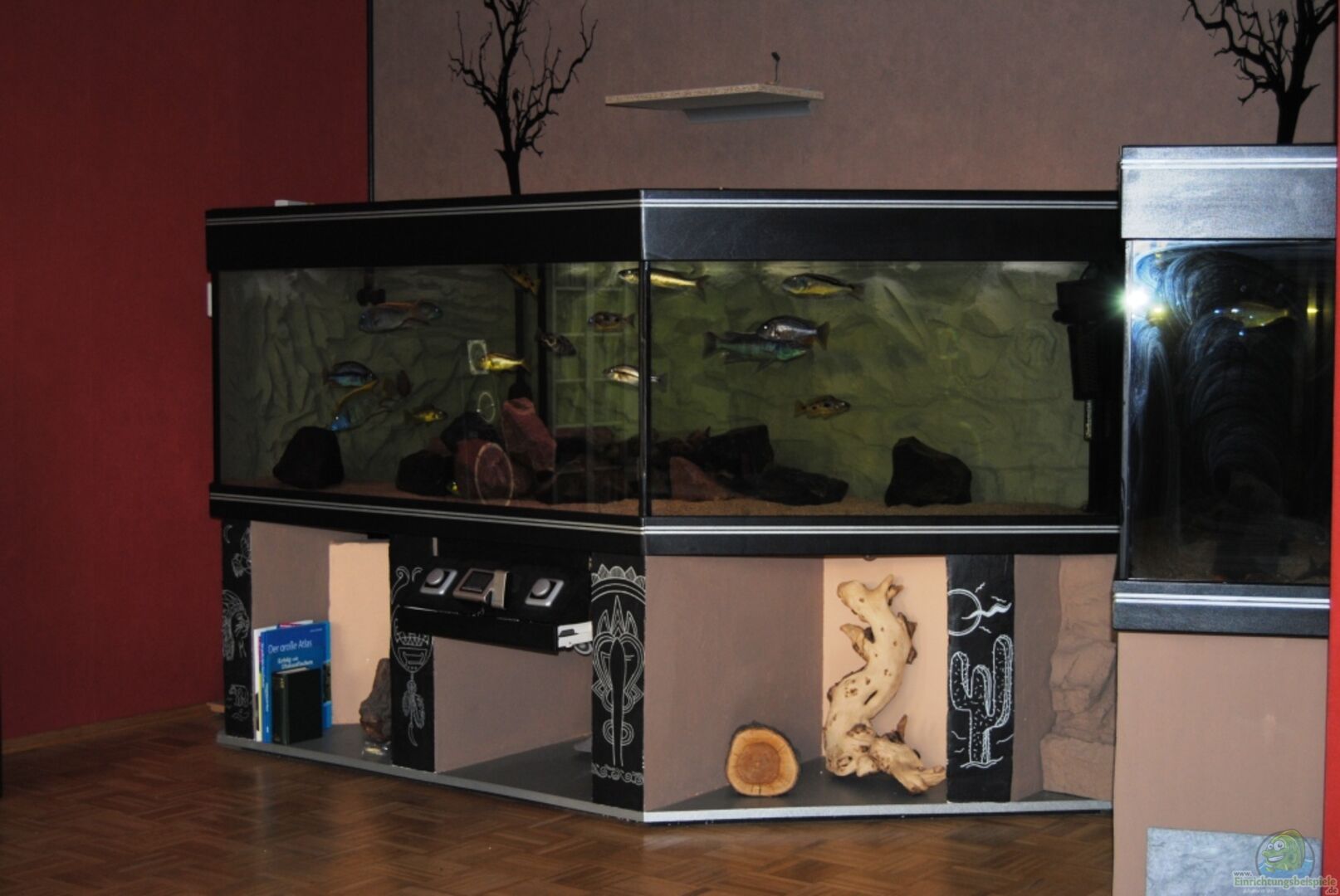 Wie soll ich das beschreiben!? Die Besonderheit an meinem Becken ist die, das es solch eine Form wohl kein zweites Mal gibt! Ganz einfach gesagt sieht das Becken von oben aus wie eine verschobene Salmiakpastille oder ein verformtes Karo. 12mm Glas wulstverklebt mit Glasstreifen verstärkt. Bis auf das Becken ist alles in Eigenregie entstanden. Auf dem Boden eine 20mm Styroporplatte, dann eine 22mm starke MDF-Platte, 4 Ytong Stützen 150mm breit, 10mm Styropor, 24mm Multiplexplatte, 5mm [...]