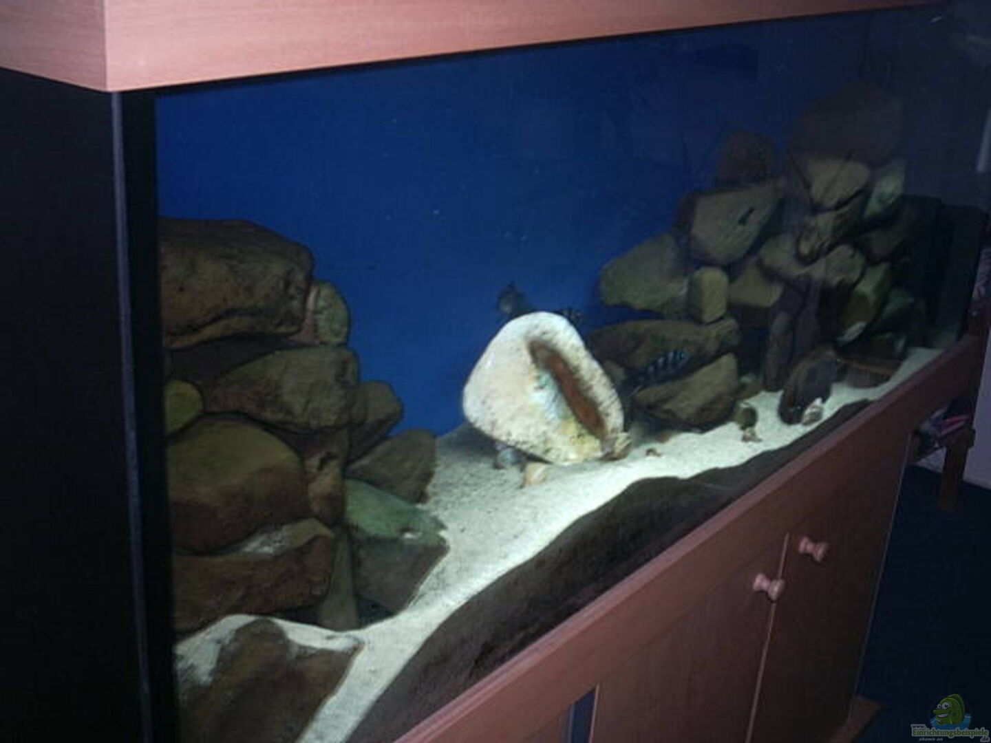 Das Becken steht seit 2005.Habe mir ein Zwei-Kammer-Filterschacht eingeklebt. Wobei die erste Kammer mit zwei gro??en Filerschwämmen, als Schnellfilter dient. In der zweiten Kammer, habe ich den Ansauger vom Au??enfilter versenkt(diese Kammer hat auch schon als Quarantäne, oder Aufzucht gedient).Der Unterschrank besteht aus Alu-Profilen und Buchenholz. Unterschrank und Abdeckung ist ebenfalls selbstgebaut.