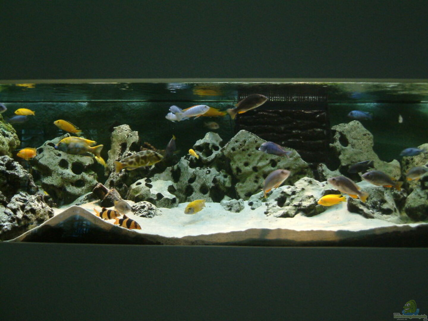 Aquarium Wulstverklebt. Glasdicke jeweils 12mm. Bodenplatte aus drei Teilstücken zusammengesetzt. Frontscheibe aus Weissglas. Zwei Bohrungen im AQ-Boden, einen für den Wasserablauf direkt in Abwasserleitung (Wasserwechsel) und die zweite, für das Wasserzulaufrohr vom Filterbecken kommend.