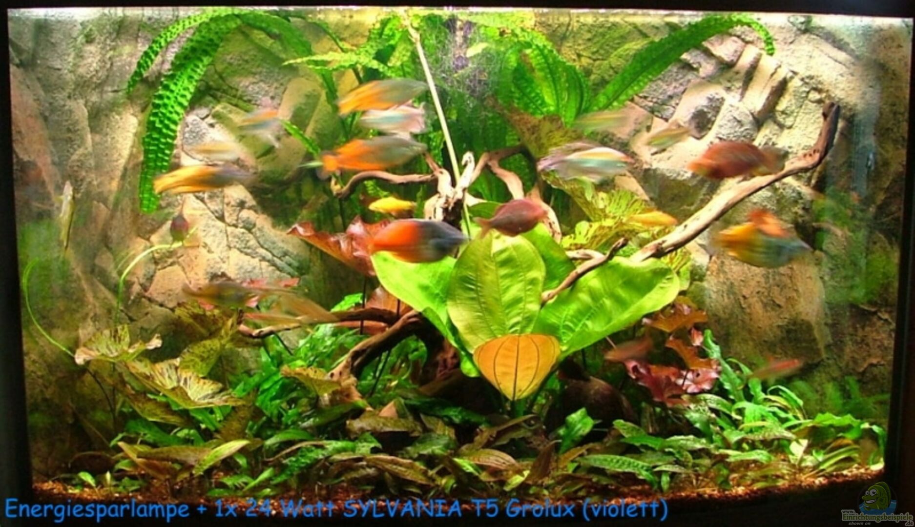 Gesellschaftsbecken mit überwiegend Regenbogenfischen in Gesellschaft mit Barben und Salmler. Reflektionsfreie Bilder mit den unterschiedlichen Beleuchtungen werden nachgereicht. Hauptaugenmerk gilt dem Pflanzenwachstum, was auf den Bildern leider nicht so zur Geltung kommt. Zu sehen ist die Blüte der roten Tigerlotus.