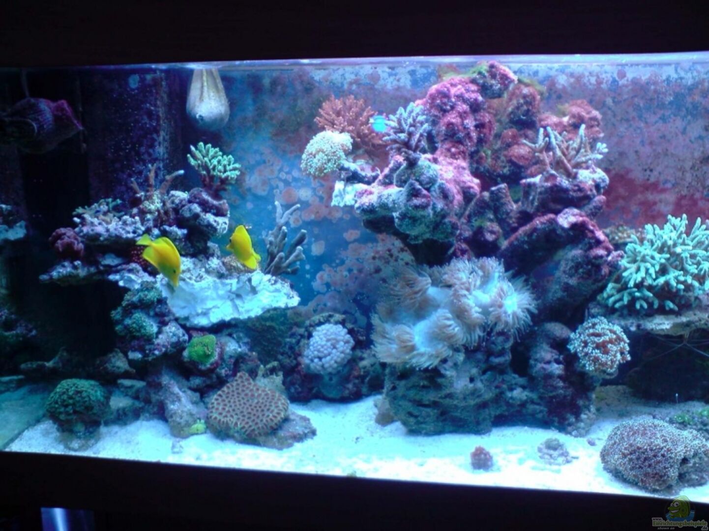 Das Becken ist sto??verklebt. Es steht auf einem mit Folie beklebten Unterschrank in Ahorn-Optik. Die Abdeckung wurde entfernt, sodass nur noch der Rahmen auf dem AQ sitzt. Darauf liegt eine Plexiglasscheibe als Katzenschutz. Dabei wurde für die Leuchten Bereiche ausgesägt um das Licht nicht verringern.