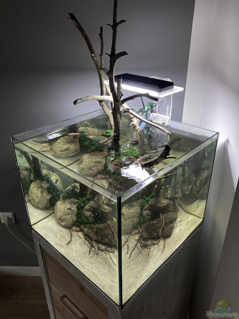 Der Unterschrank ist ein Eigenbau, da mir keiner so richtig gefiel. Ich wollte ein Aquarium welches zugleich als Möbelstück fungiert. Beton, Holz, Glas, so habe ich mir das vorgestellt. Ein Schränkchen mit den Ma??en 50x50x80 aus Beton, inklusive Türe aus Massivholz, hätte ca. 800.- Euro gekostet, dass war bzw. ist mir allerdings zu teuer. Deshalb musste ein Eingebau her. Die Internetseite www.grey-element.de gab mir Mut das Ganze selbst in Angriff zu nehmen. Das Projekt kam auf ca. 80.- Euro, [...]