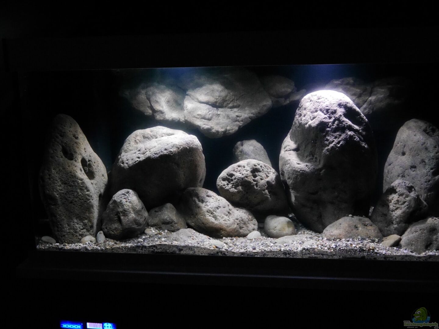 Becken von Brillant-Aquarium, 12mm Glasstärke, eine Querverstrebung, Wulstverklebung und wei??e Kiesblende. Die Abdeckung ist von Aquarienabdeckungen Runge (www.aquarienabdeckungen.com) und verfügt über 3 Klappen sowie 5 Bohrungen auf der Rückseite für Schläuche, Kabel etc. Die Unterkonstruktion ist selbstgebaut auf Stahl. Unter der Stahlkonstruktion befindet sich eine 4cm Küchenarbeitsplatte, ebenso zwischen Becken und Unterbau. Zudem wurde das Becken mit Schwerlastverankerungen [...]