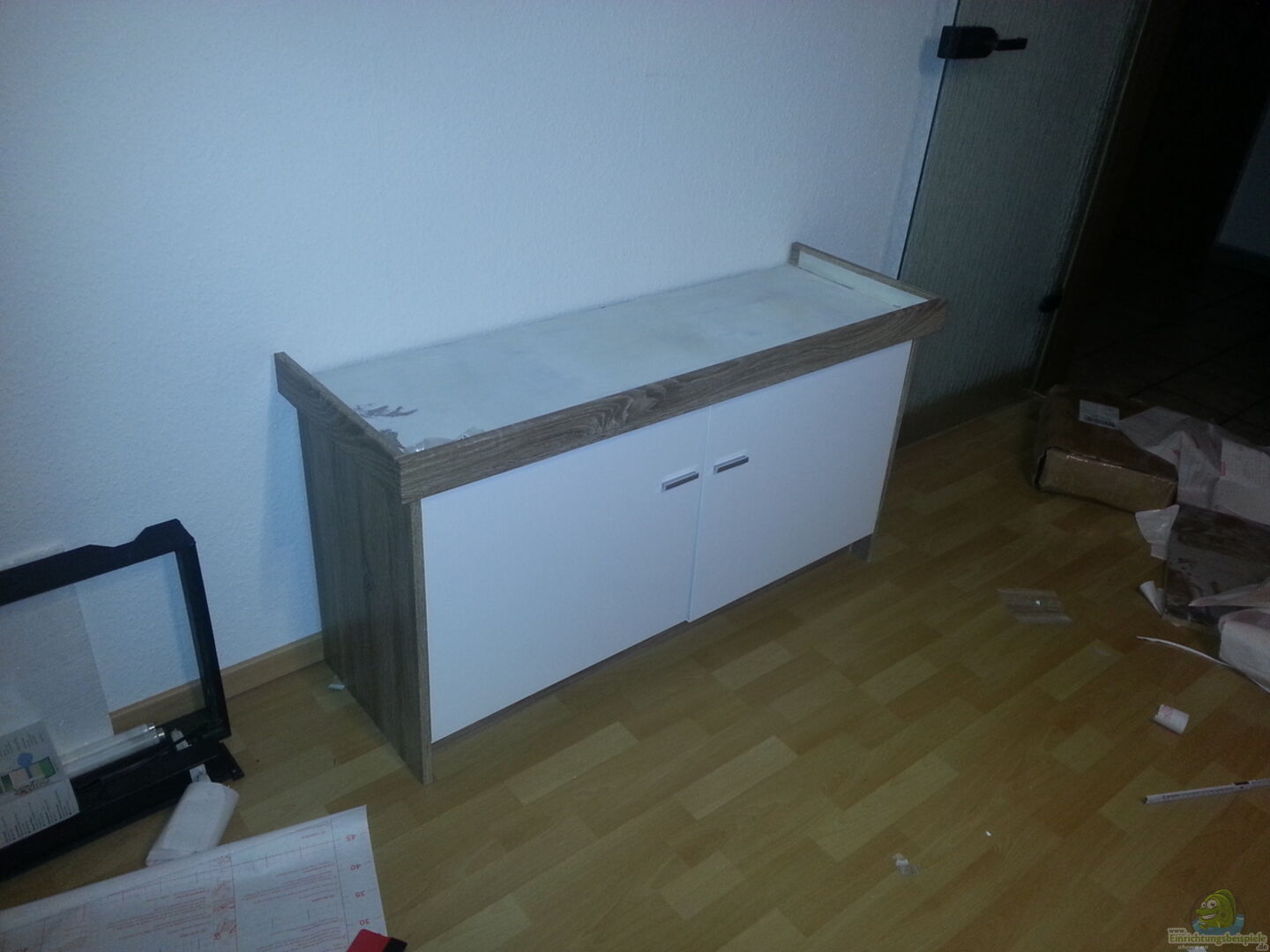 Das Becken habe ich im Mai 2014 mit Unterschrank und Abdeckung gebraucht gekauft. Der Unterschrank war von der Form her gut gemacht, nur leider wurde er vom Vorbesitzer wei?? angestrichen und sah nicht mehr so schön aus. Ich habe ihn also abgeschliffen und mit Folie passend zu unseren restlichen Möbeln beklebt. Dabei war eine T8-Beleuchtung. Diese habe ich vor dem Start gegen T5 ausgetauscht.