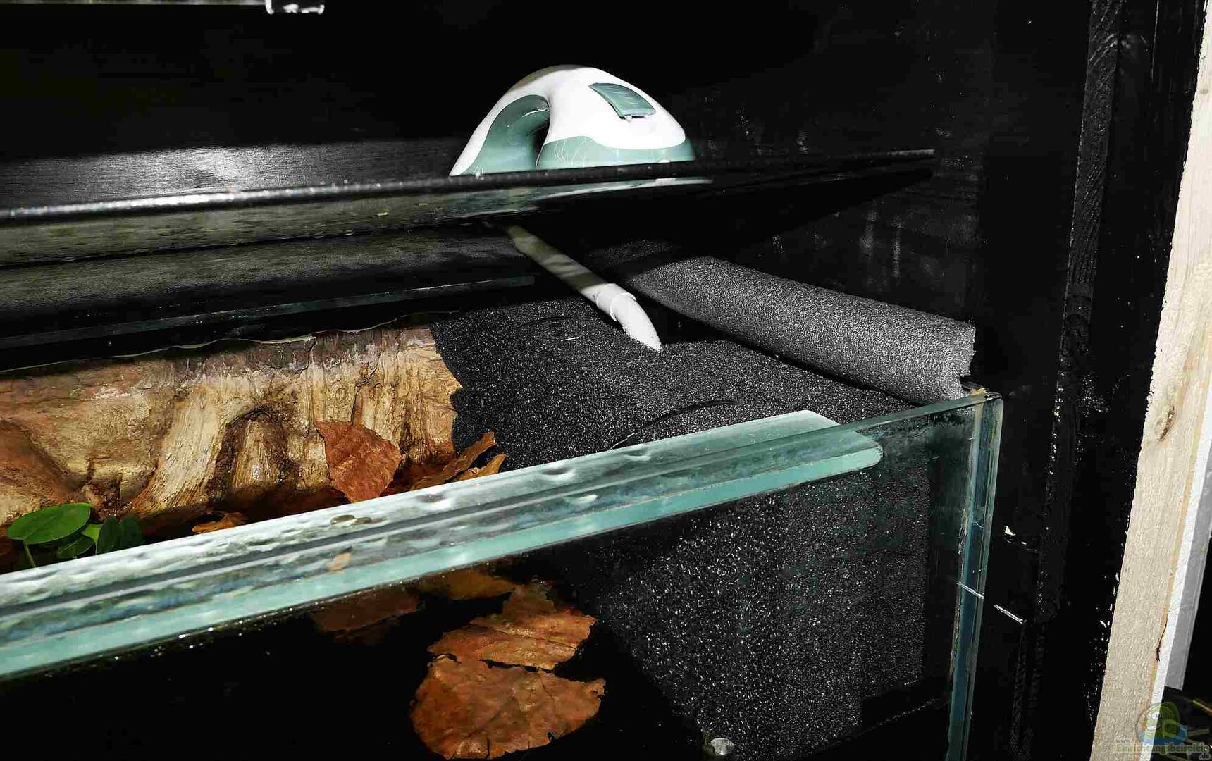 Das Becken ist nur mit ca 150-160 L befüllt. Es ist mit einer ausbruchsicher dichten Glasscheibe abgedeckt.