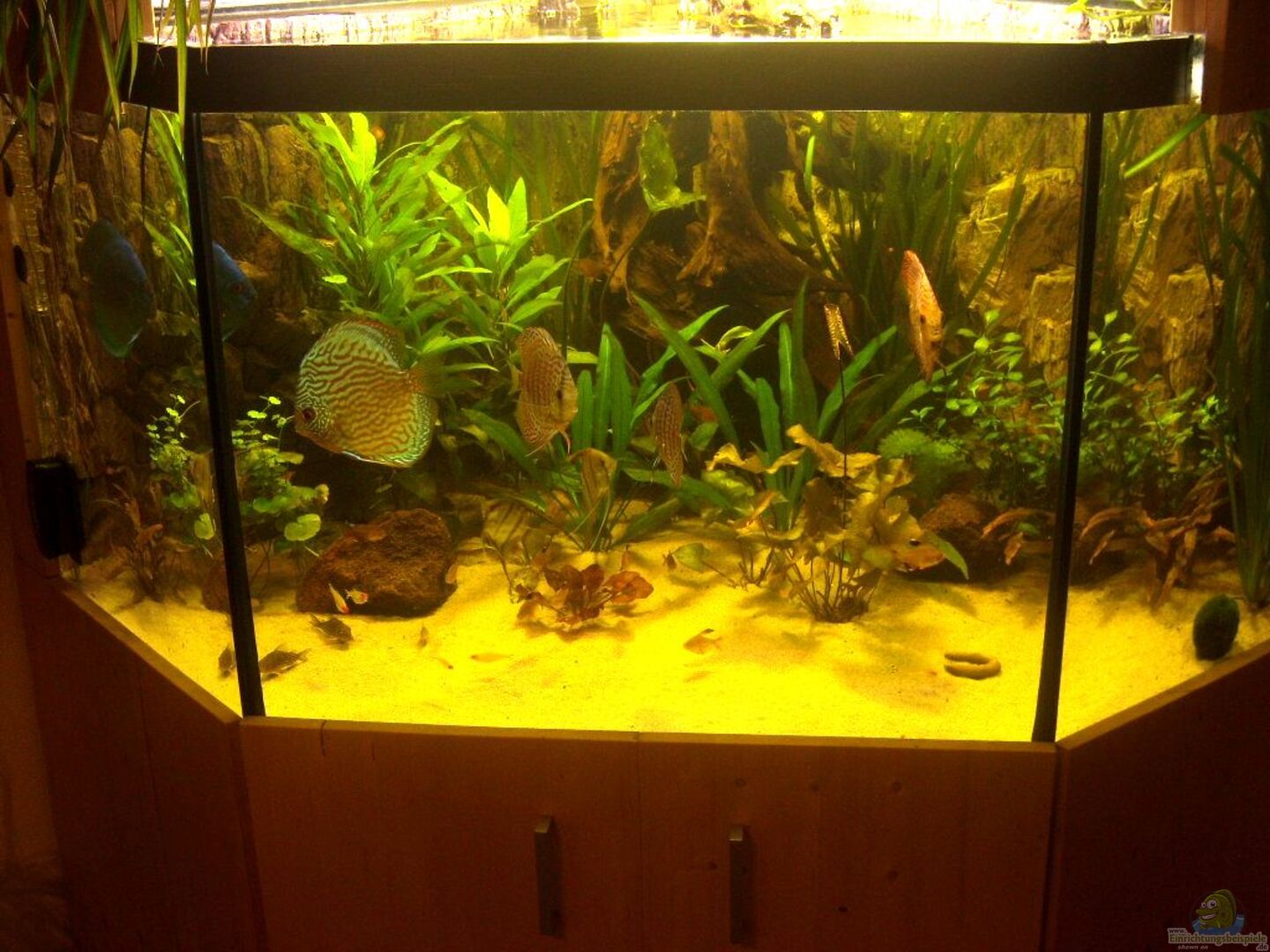 Das Becken wurde am 04.09.09 ersteigert. Mein altes Deltabecken ca 300 l hat nach ca 12 Jahren sein Dienst getan. Das neue Becken ist eine Sonderanfertigung. Das Alu Untergestell mit Decken und Bodenplatte.Höhe 75cm wurde von mir auf 65cm gekürzt. Da die Rückwand 15 cm zu Niedrig ist ( der Vorbesitzer hatte 15 cm Kiesschicht )habe ich mir ein Sockel aus Styropor selber angefertigt. Das Becken hat unten ein Abllauf für Wasserwechsel, wo ich auch den Eheimfilter angeschlossen habe.