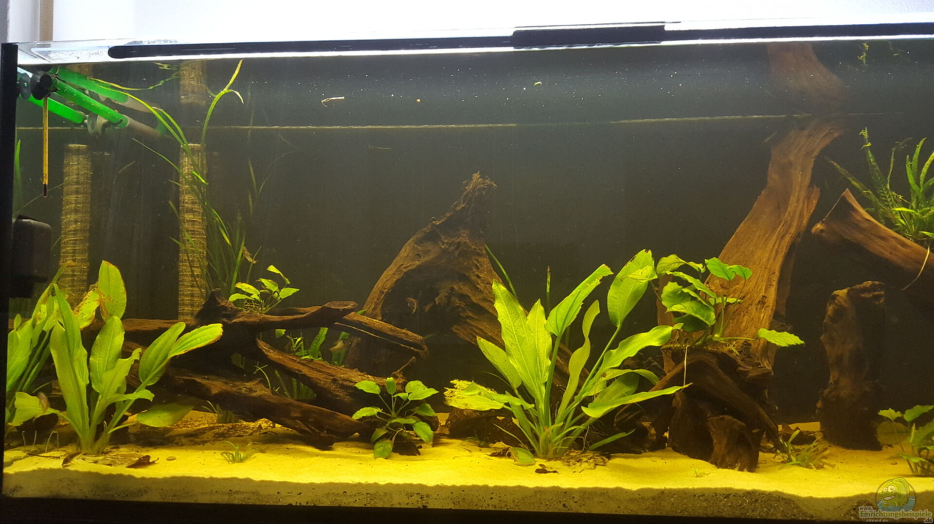 Bei meinem Aquarium handelt es sich um das Model Juwel Rio 400 im Farbstich schwarz. Leer wiegt das Aquarium 86 kg und der Unterschrank hat ein Gewicht von 50 kg. Die Glasplatten haben eine Dicke von 1, 2 cm. Zwischen Glas und Unterschrank befindet sich eine kleine schwarze Matte um Unebenheiten des Aquariums auszugleichen. Den Standort des Beckens habe ich so gewählt, dass möglichst wenig bis gar keine Sonnenstrahlen auf das Becken fallen und möglichst wenig Geschehen um das Aquarium herum [...]