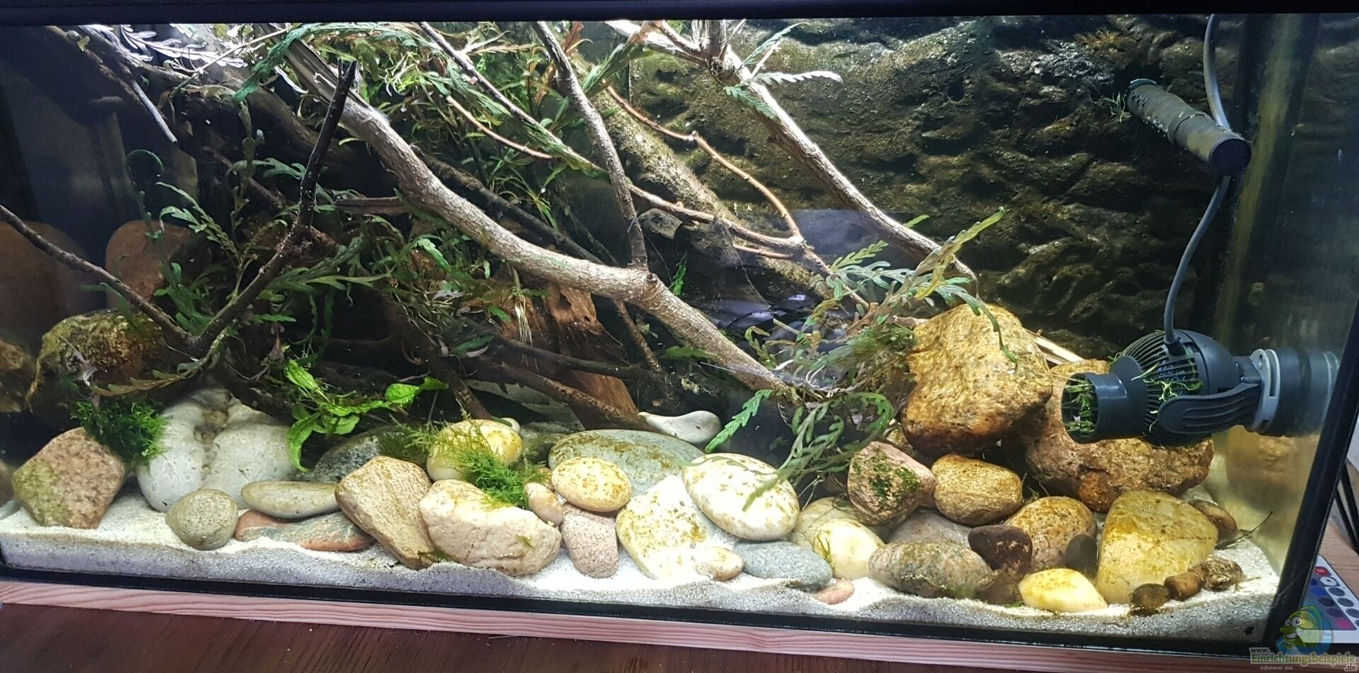 Bei dem Aquarium handelt es sich um eine Sonderanfertigung, welche ich günstig gebraucht über Ebay Kleinanzeigen erworben habe. Das Aquarium besitzt einen gro??en eingebauten Biofilter, welcher einiges der Grundfläche in Anspruch nimmt, dabei aber extrem wartungsfrei läuft. Auch der Standort ist relativ au??ergewöhnlich. Es steht nämlich direkt in einer Nische auf dem Esstisch aus Massivholz, passte dort optimal hin und macht sich wirklich gut! ;-)