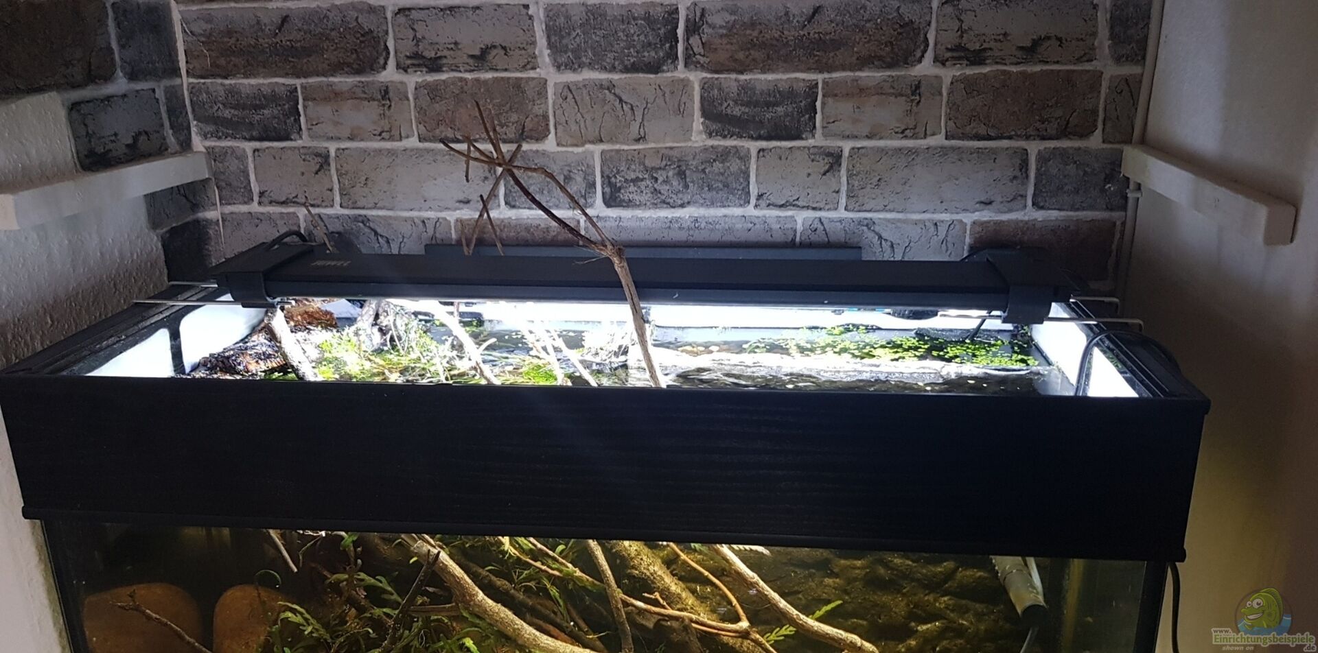 Bei dem Aquarium handelt es sich um eine Sonderanfertigung, welche ich günstig gebraucht über Ebay Kleinanzeigen erworben habe. Das Aquarium besitzt einen gro??en eingebauten Biofilter, welcher einiges der Grundfläche in Anspruch nimmt, dabei aber extrem wartungsfrei läuft. Auch der Standort ist relativ au??ergewöhnlich. Es steht nämlich direkt in einer Nische auf dem Esstisch aus Massivholz, passte dort optimal hin und macht sich wirklich gut! ;-)