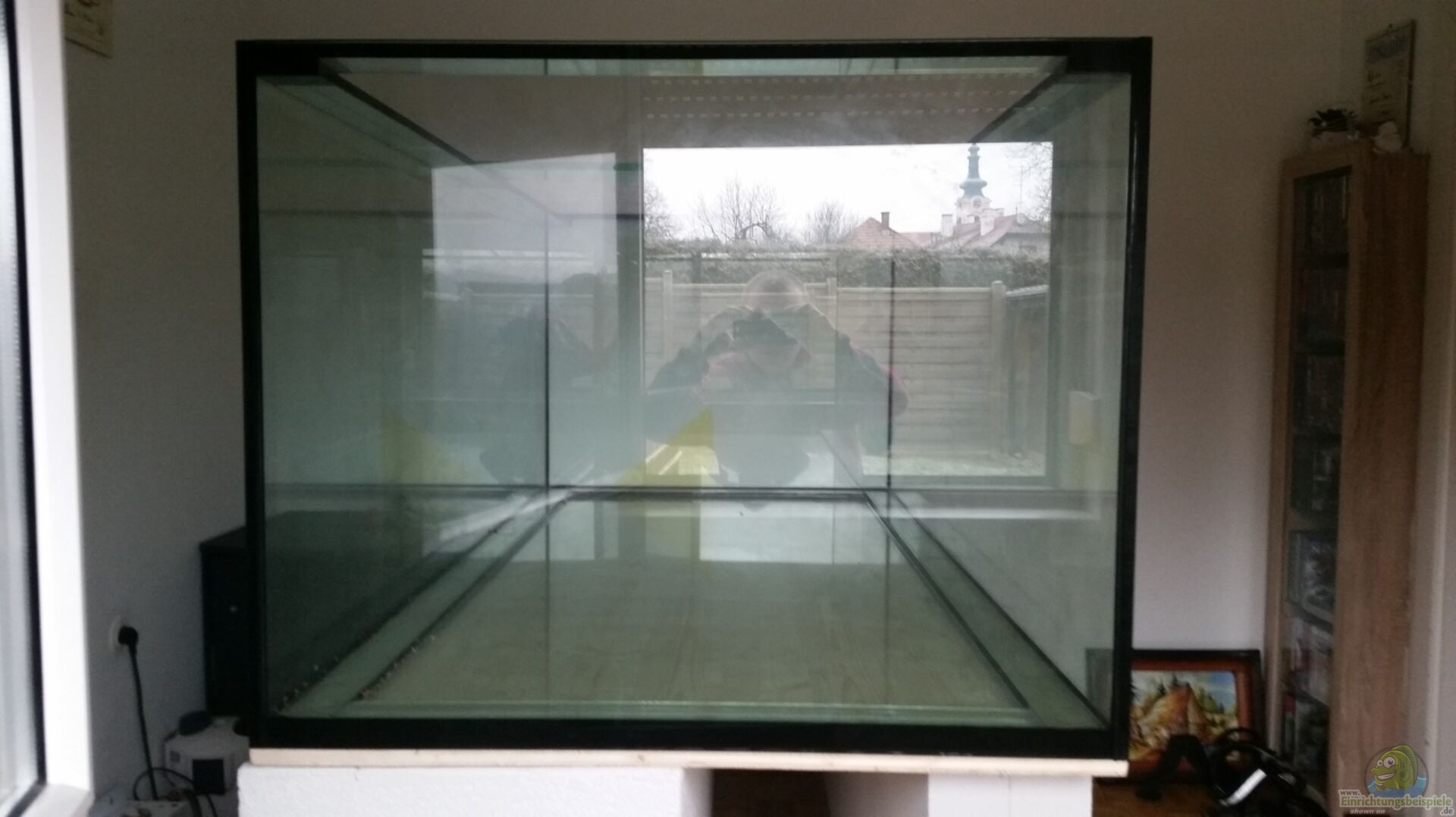 Das Aquarium ist eine Sonderanfertig und hat oben 3 Querstreben, 2 Längsstreben und ist unten im Aquarium Rundumverstrebt!! Es steht auf Ytong Steine die mit Holz oder Steinfliesen verkleidet werden auf die Rückwand und recht Seitenscheibe kommt eine schwarze Folie