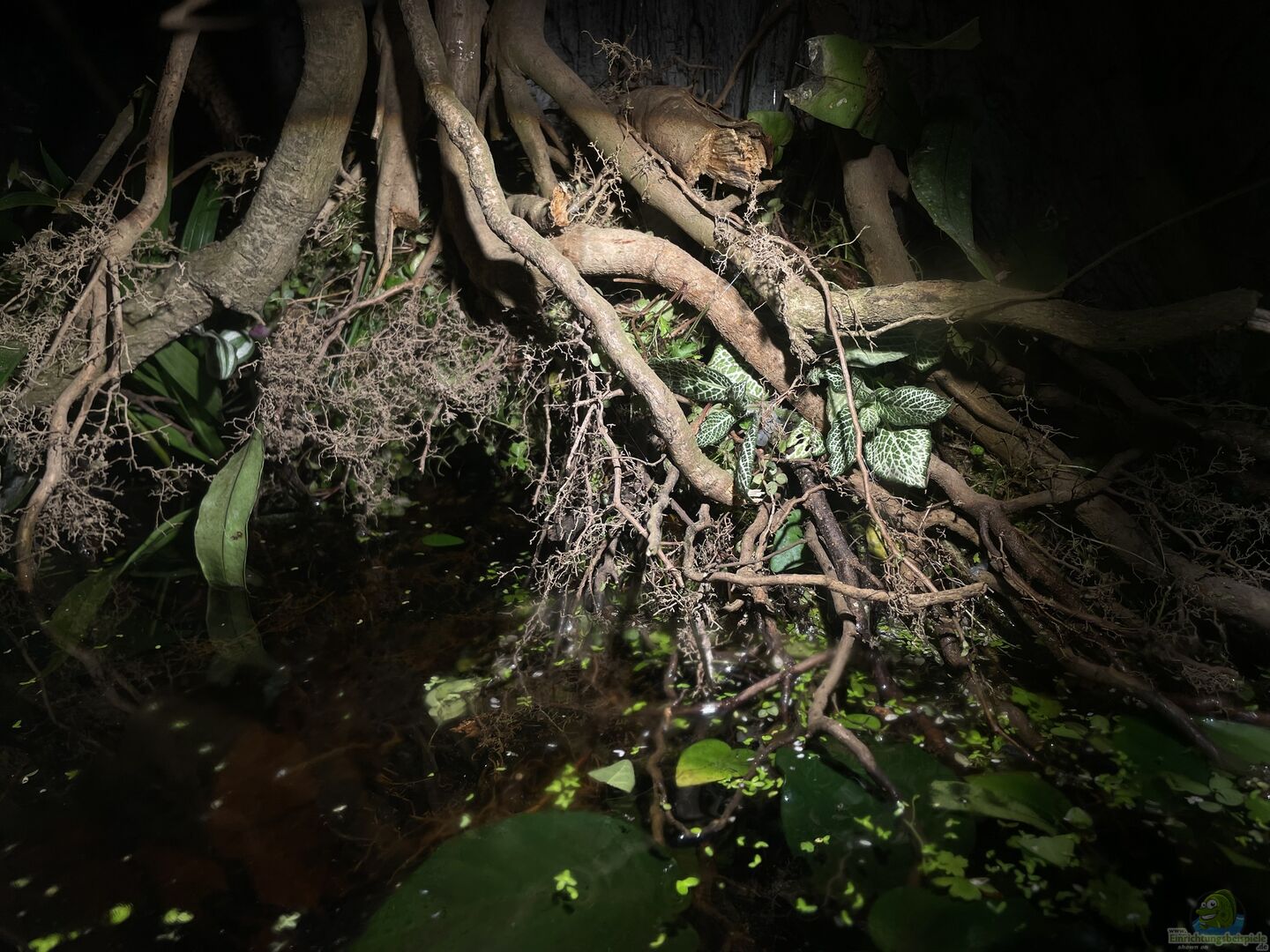 Grundlage ist das ehemalige Betta Macrostoma Becken. Das Juwel Rio 350 Becken ist nur zur Hälfte gefüllt. Oberhalb ist somit knapp 30cm Platz für einen kleinen, emersen Bereich mit diversen Pflanzen und Wurzeln. Da das Grundgerüst mithilfe von Ästen und Filtermatten knapp über der Wasseroberfläche angebracht ist, kann der Bereich komplett unterschwommen werden. Somit verlieren die Tiere trotzt der Gestaltung keinen Schwimmraum in die Tiefe. Strukturrückwand im Abstand von ~ 15cm [...]
