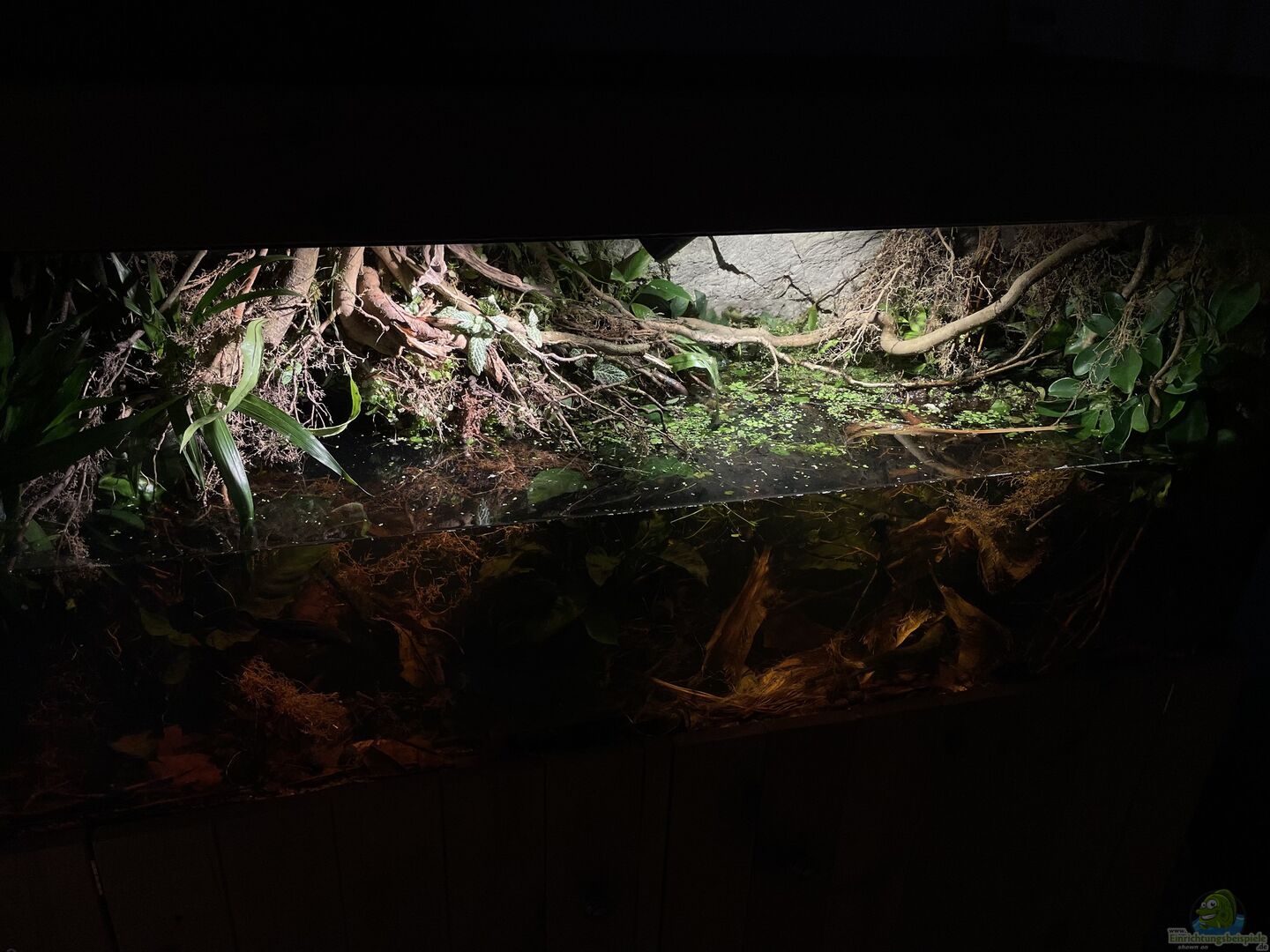 Grundlage ist das ehemalige Betta Macrostoma Becken. Das Juwel Rio 350 Becken ist nur zur Hälfte gefüllt. Oberhalb ist somit knapp 30cm Platz für einen kleinen, emersen Bereich mit diversen Pflanzen und Wurzeln. Da das Grundgerüst mithilfe von Ästen und Filtermatten knapp über der Wasseroberfläche angebracht ist, kann der Bereich komplett unterschwommen werden. Somit verlieren die Tiere trotzt der Gestaltung keinen Schwimmraum in die Tiefe. Strukturrückwand im Abstand von ~ 15cm [...]