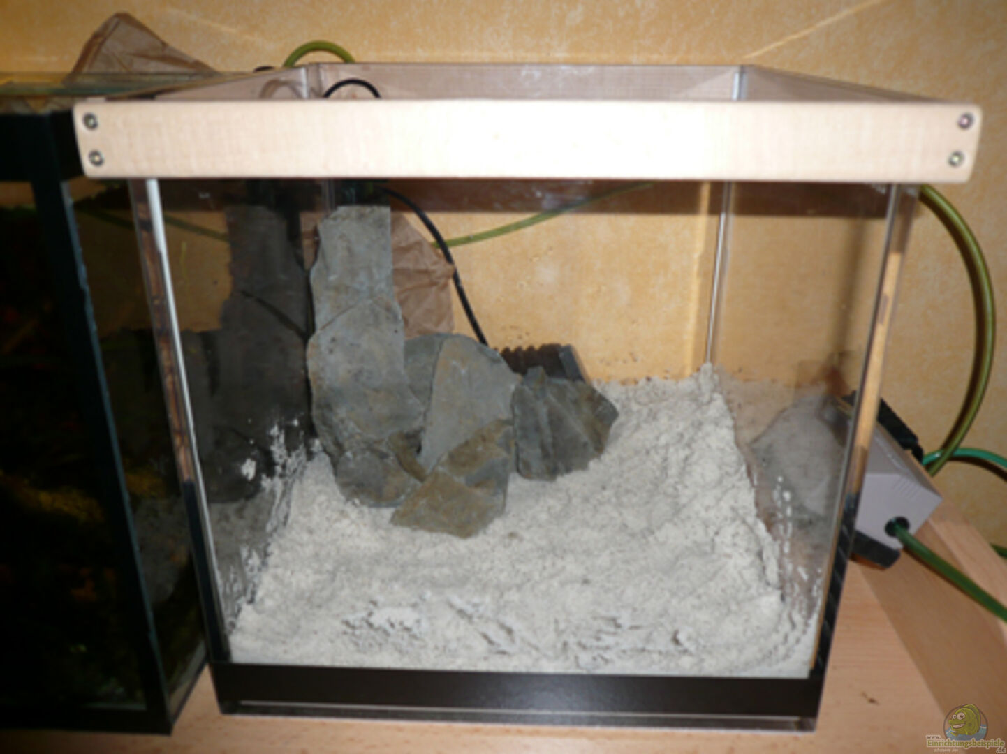 Ursprünglich war das mal ein Kasten, in dem Kameras präsentiert wurden.Es urde ein Holzrahmen um das Becken gebaut, damit die Scheiben stabil sind und sich nicht so durchbiegen, dass man Angst haben muss, gleich fällt das Becken auseinander Das Becken hat ein Volumen von 22, 5 Litern, nur lie??en sich Kommazahlen nicht schreiben.