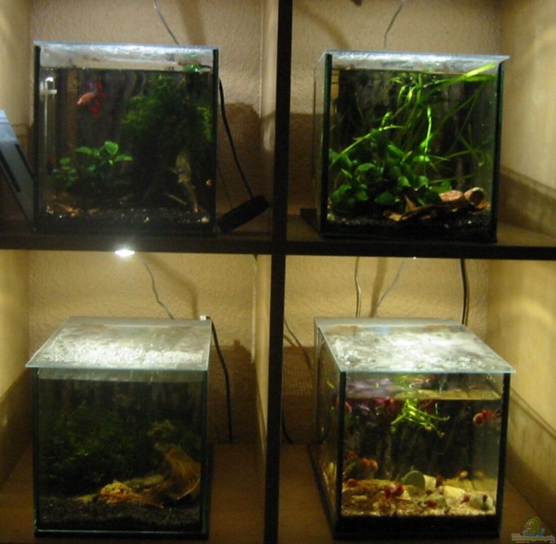 Alle Becken, die Deckel und die Filter sind Marke Eigenbau und von der Grö??e her auf das Ikea Expedit-Regal abgestimmt. Bei den Plexiglas-Abdeckungen bin ich ganz besonders Stolz über meine Idee. Das Lochblech ist genau so breit wie der Filter, so dass dort Luft rein aber keine Tiere raus können.(selbst Krebse hätten es wirklich schwer!) Das Lochblech ist am Aquarium festgemacht, mit kleinen Schanieren lässt sich so eine Abdeckung zum Füttern und reinigen anheben.