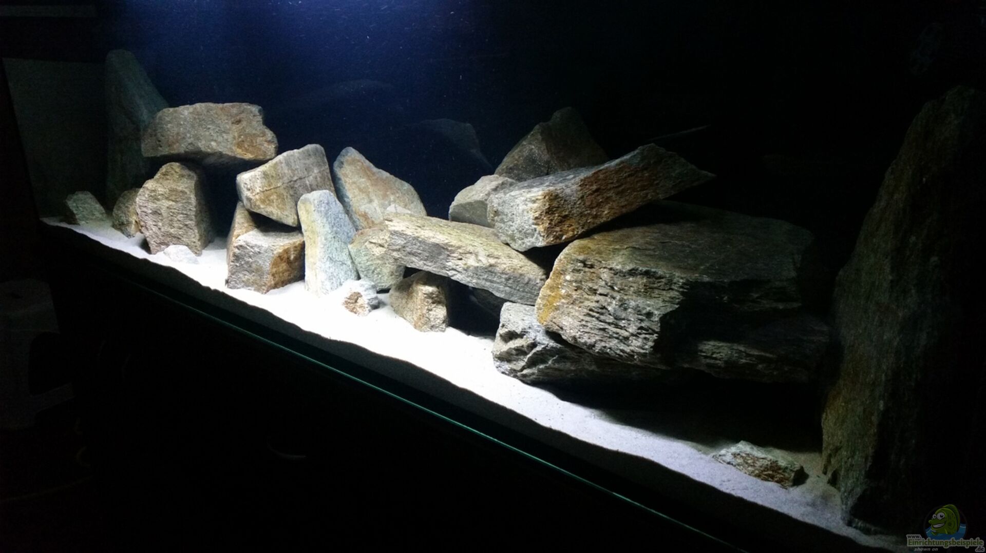 Bei dem Becken wurde absichtlich auf jegliche Module verzichtet um einen möglichst realistischen Lebensraum für die, in diesem Fall NonMbunas zu gestallten. DerBesatz wurde auf Carnivor zu ernährende Malawi´s beschränkt um eine optimale Ernährung der Tiere zu erreichen. Die Einrichtung besteht ausschlie??lich aus Schiefersteinen, welche die Geröllzone im Malawisee imitieren soll. Glasplattenabdeckung mit Schiebesystem aus dem Baumarkt