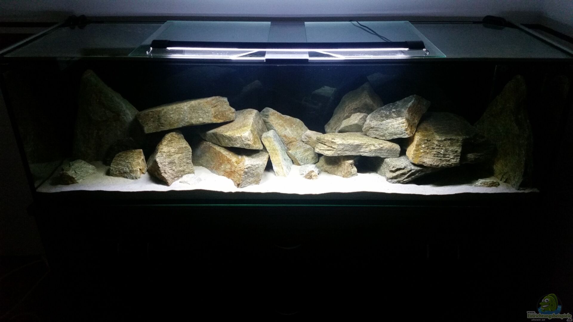 Bei dem Becken wurde absichtlich auf jegliche Module verzichtet um einen möglichst realistischen Lebensraum für die, in diesem Fall NonMbunas zu gestallten. DerBesatz wurde auf Carnivor zu ernährende Malawi´s beschränkt um eine optimale Ernährung der Tiere zu erreichen. Die Einrichtung besteht ausschlie??lich aus Schiefersteinen, welche die Geröllzone im Malawisee imitieren soll. Glasplattenabdeckung mit Schiebesystem aus dem Baumarkt