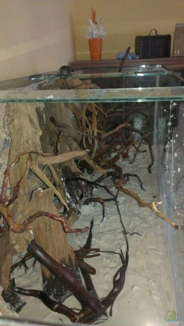 Das Aquarium ist ein Garagenfund. Das Becken steht auf einem geschwei??ten Stahlrahmen. Da die Scheiben aber so sehr verkratzt waren, habe ich mich dazu entschieden die Frontscheibe gegen eine neue zu tauschen. Im Zuge dessen, wurden auch alle Innennähte erneuert. Nach anfänglichen Bedenken, hält es aber bis jetzt dicht :-)