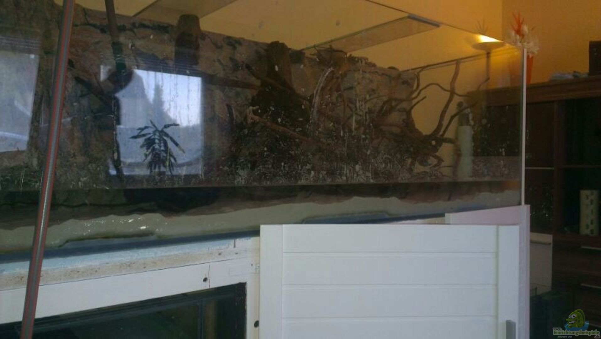 Das Aquarium ist ein Garagenfund. Das Becken steht auf einem geschwei??ten Stahlrahmen. Da die Scheiben aber so sehr verkratzt waren, habe ich mich dazu entschieden die Frontscheibe gegen eine neue zu tauschen. Im Zuge dessen, wurden auch alle Innennähte erneuert. Nach anfänglichen Bedenken, hält es aber bis jetzt dicht :-)