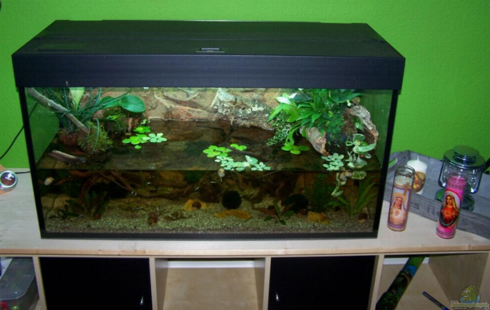 In dem Becken befindet sich eine Korköhre mit Pflanzzone Es ist nur bis etwa zur Hälfte gefüllt ( Wassermenge ungefähr 70l ) Der Besatz beinhaltet eine neozoene tropische Fischart. Es handelt sich dabei um einen Stamm der seit den 70ern in Deutschland bekannt ist und sich dem Wildtyp wieder angenähert hat.