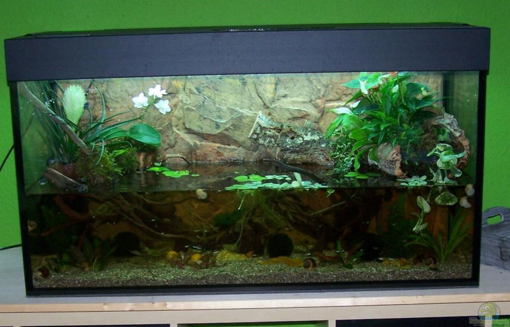 In dem Becken befindet sich eine Korköhre mit Pflanzzone Es ist nur bis etwa zur Hälfte gefüllt ( Wassermenge ungefähr 70l ) Der Besatz beinhaltet eine neozoene tropische Fischart. Es handelt sich dabei um einen Stamm der seit den 70ern in Deutschland bekannt ist und sich dem Wildtyp wieder angenähert hat.
