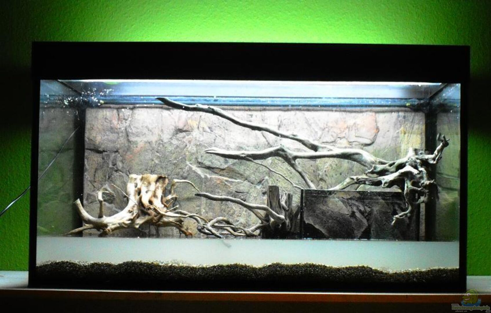In dem Becken befindet sich eine Korköhre mit Pflanzzone Es ist nur bis etwa zur Hälfte gefüllt ( Wassermenge ungefähr 70l ) Der Besatz beinhaltet eine neozoene tropische Fischart. Es handelt sich dabei um einen Stamm der seit den 70ern in Deutschland bekannt ist und sich dem Wildtyp wieder angenähert hat.