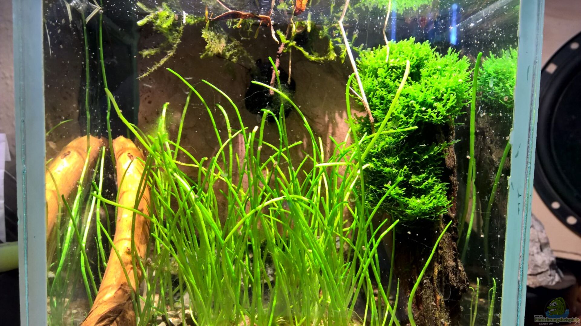 Dieses Becken ist ein kleiner Versuch das Füttern meiner Kakadubuntbarsche mit einer hübschen Schreibtischdeko zu vereinen. Da ich in meinem zweiten Becken keine ganze Tüte Wasserflöhe füttern möchte, habe ich nach einer Aufbewahrungsmöglichkeit gesucht. Im Keller fand ich dann dieses Minibecken und schon war die Idee geboren. Bin gespannt wie sich dieses sehr kleine Biotop entwickelt und ob sich eventuell die Wasserflöhe vermehren, sodass ich nicht ständig nachkaufen muss.