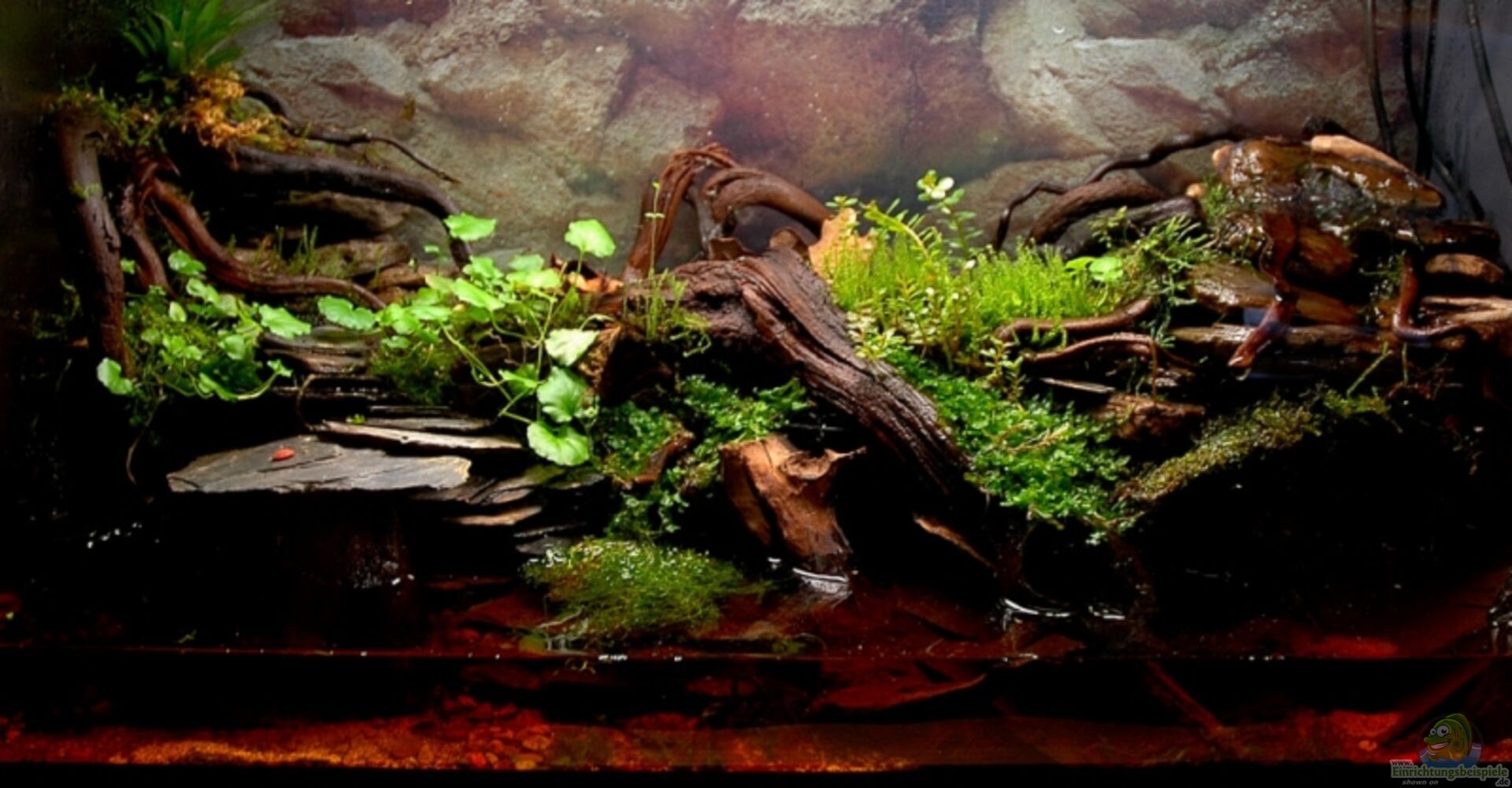 Der hintere Teil des Aquariums ist mit einer 10cm hohen Gla??scheibe abgetrennt und mit dem Sand Torf Terrariengrund Gemisch gefüllt, das sowohl als Rückzugszone als auch als buddel Paradies für die Vampierkrabben genutzt werden kann. Auf der rechten Seite befindet sich ein kleiner selbstgebastelter Wasserfall der gleichzeitig als Filter dient.