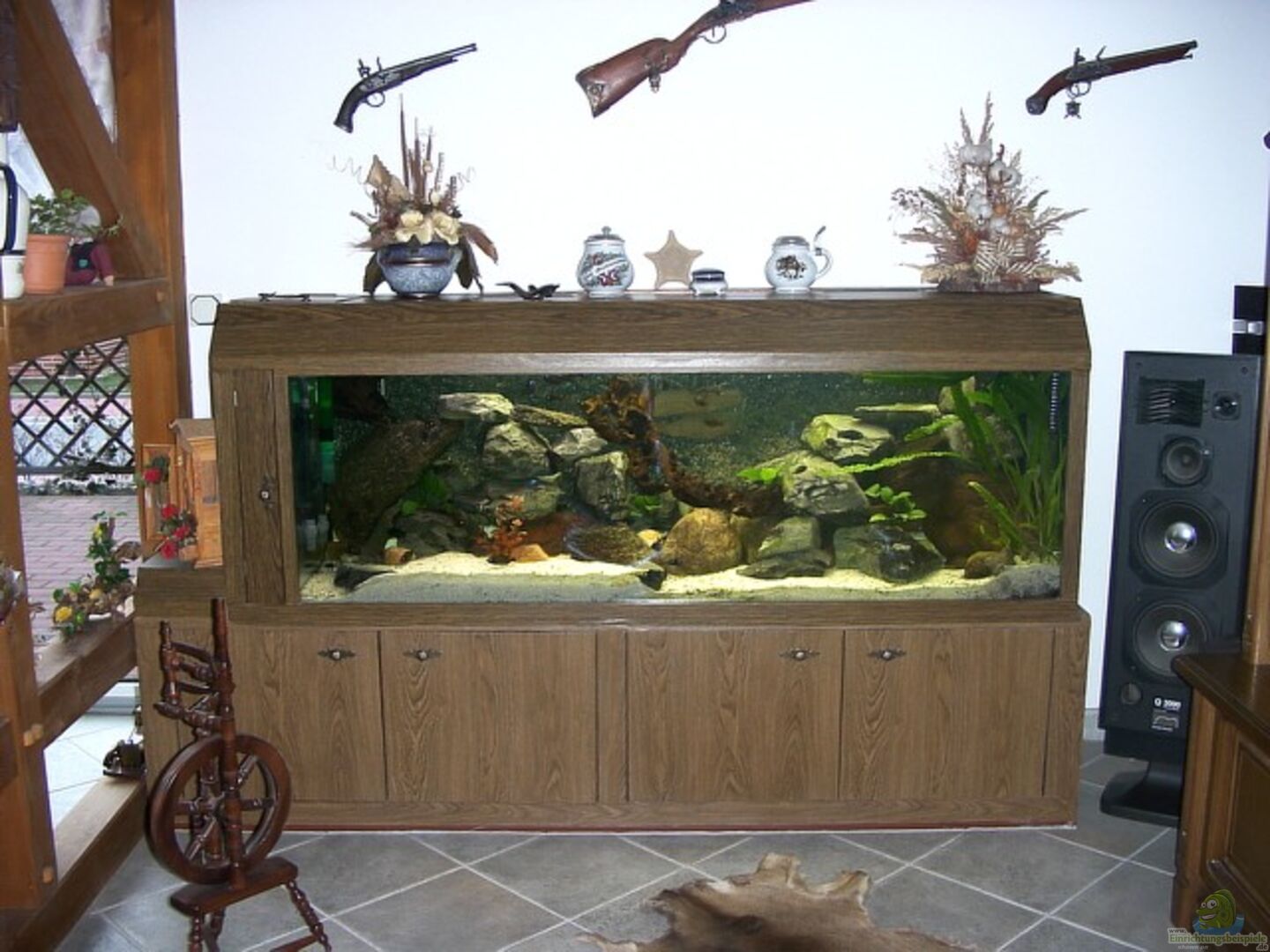 Das Aquarium steht auf einer 20mm Styroporplatte, die Unterkonstruktion ist Eigenbau (40mm starke Winkelprofile, mit Dekorplatten verkleidet). Die Rückwand besteht ebenfalls aus einer 20mm Styroporplatte, diese ist reliefartig ausgearbeitet worden, mit schwarzer Dispersionsfarbe gestrichen und dekoriert.
