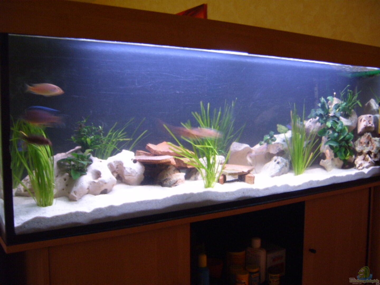 Juwel Rio 400 ca. 375 Liter Das Becken steht zwischen einem Stützfeiler und einer Wand. Eingesetzt als Raumtrenner zwischen Wohn- und Esszimmer. Es steht auf dem passen Unterschrank der Firma Juwel mit Fliesmatte. Da ich das Becken leider gebraucht gekauft habe sind an einer Längsscheibe verätzungen in der Glascheibe zu erkennen. Diese lassen sich auch leider nicht mehr entfernen.