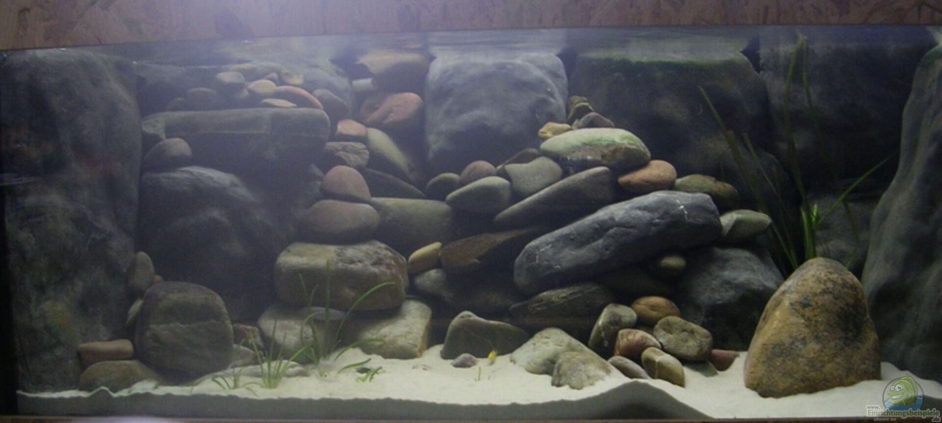 Die Rückwand ist eigentlich keine sondern aus Zement gebaute Felsen. Diese sind von innen hohl und bieten den Mbunas somit die Möglichkeit das ganze Becken zu durchschwimmen. Zudem sind hinter diesen noch Steine im unteren Bereich so das die gö??eren Höhlen noch mal unterteilt sind. Zusammen mit dem Steinaufbau vorne hab ich somit den Platz optimal genutzt um genug Versteckmöglichkeiten zu bieten. Die Zementfelsen wurden im übrigen gewässert und somit ständg das Wasser geprüft um festzustellen [...]