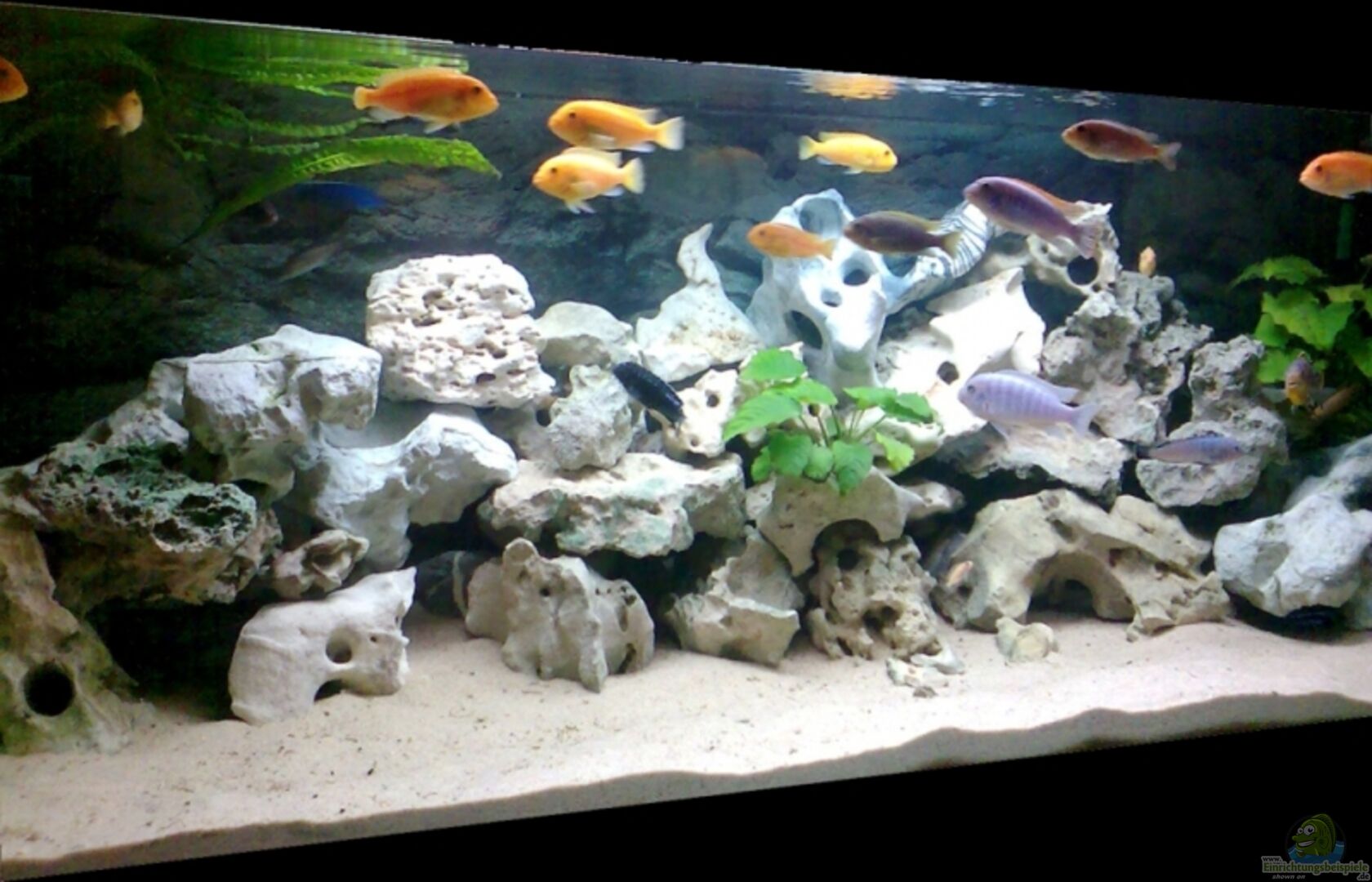Das Becken ist oben offen, Glasscheiben dienen hier als Abdeckung. In der linken Ecke befinden sich Dekosteine aus Polyrin der Fa. Europet (Modell: Combo-Felblak) 1xGrö??e XXL, 1xGrö??e L und in der Mitte 1xGrö??e XXL. Die Dekosteine sind innen hohl, man bemerkt den Unterschied zu echtem Lochgestein kaum.