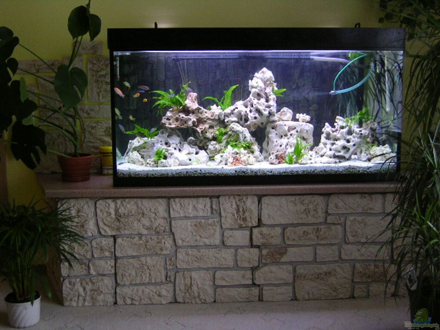 Der Unterbau des Auqriums besteht aus einem Stahlgerüst, was von mir mit Verblendsteinen verkleidet wurde. Die Frontteile können herausgenommen werden, so dass der Stauraum unter dem Becken genutzt werden kann.Der Lampenkasten und die Rückwand wurden auch selbst gebaut.