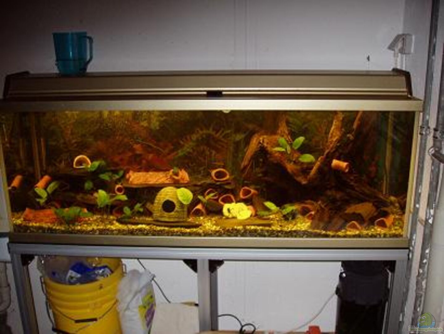Reines Welsbecken sonst keine Fische! Selbergemachtes Gestell aus Aluprofilen, Hintergrundbild Amazonas an Wand befestigt, Becken steht im Heizraum da es dort schön warm ist.