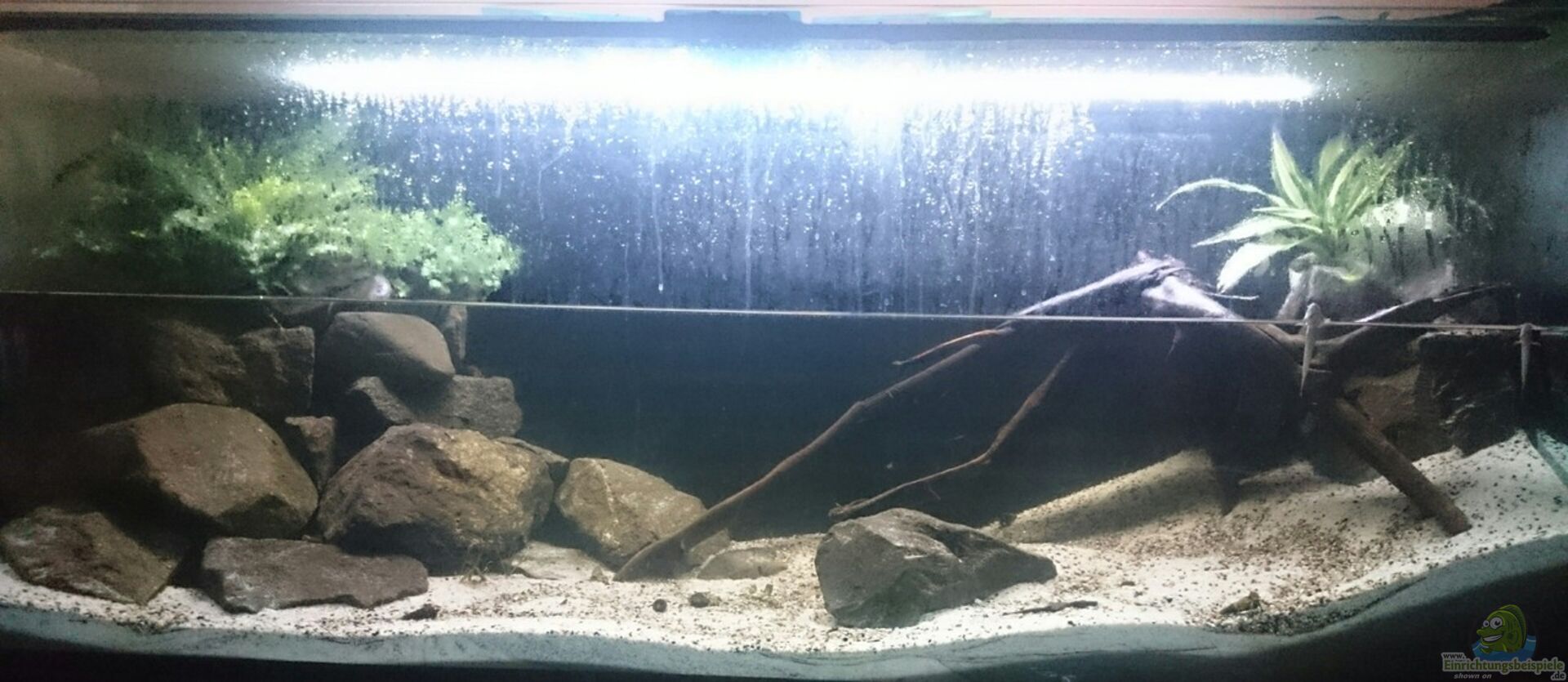 In daas Aquarium würden 450 Liter hineinpassen, da ich aber ein Paludarium habe, sind es nur circa 250 Liter. Schwarze Rückwand: schwarze Klebefolie von au??en angeklebt. Auf dem Aquarium liegen Glasscheiben.