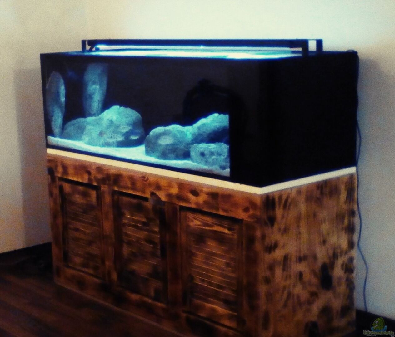 Das Aquarium ist von der Firma Emmel es ist sto?? und Wulst verklebt es hat 2 Querstreben und eine Längs Strebe es ist aus 10 mm Glas und es ist an den Seiten und an der Rückwand schwarz Folie Es hat 4 Glasscheiben in E Profilen als Abdeckung.