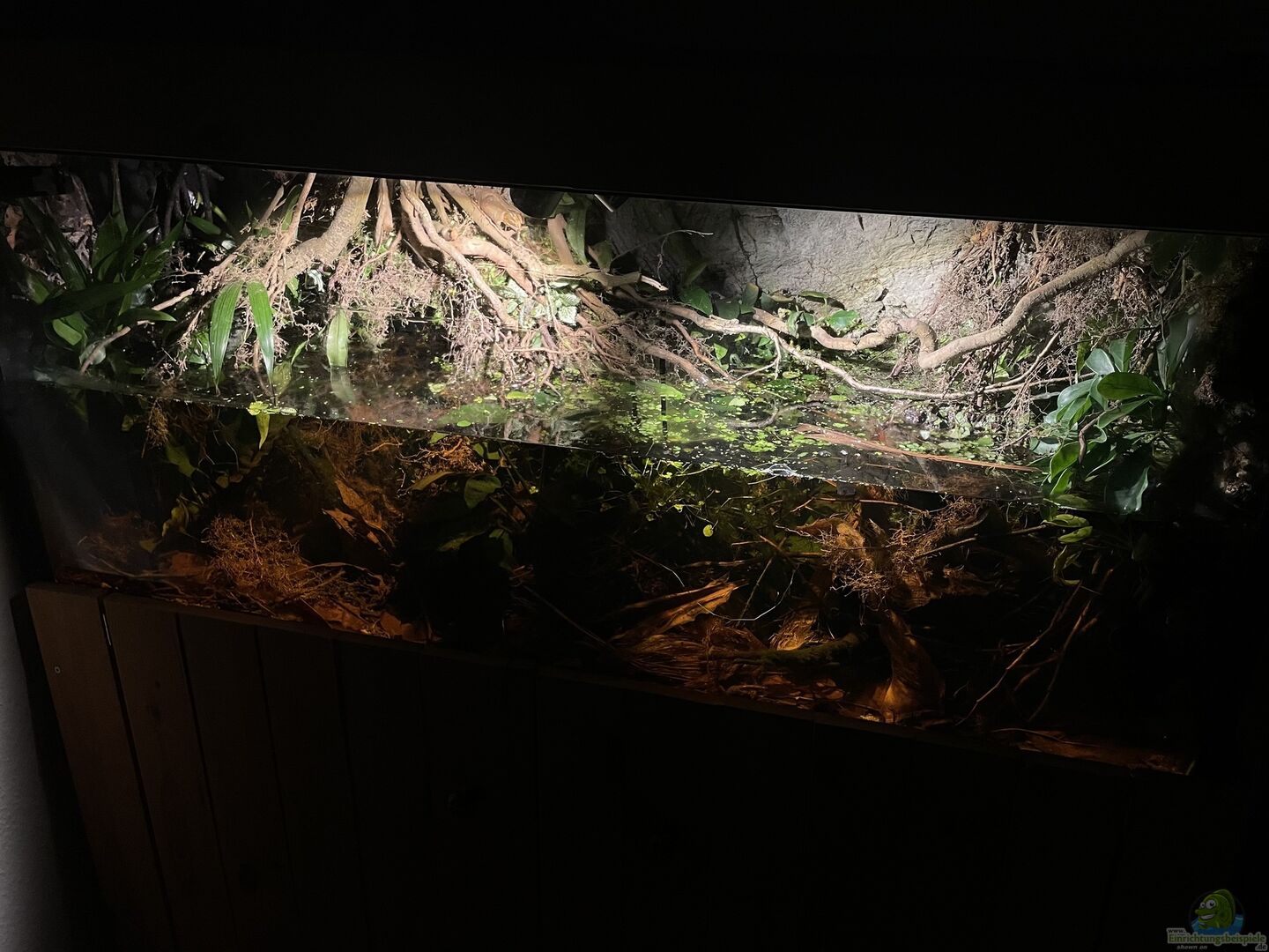 Grundlage ist das ehemalige Betta Macrostoma Becken. Das Juwel Rio 350 Becken ist nur zur Hälfte gefüllt. Oberhalb ist somit knapp 30cm Platz für einen kleinen, emersen Bereich mit diversen Pflanzen und Wurzeln. Da das Grundgerüst mithilfe von Ästen und Filtermatten knapp über der Wasseroberfläche angebracht ist, kann der Bereich komplett unterschwommen werden. Somit verlieren die Tiere trotzt der Gestaltung keinen Schwimmraum in die Tiefe. Strukturrückwand im Abstand von ~ 15cm [...]
