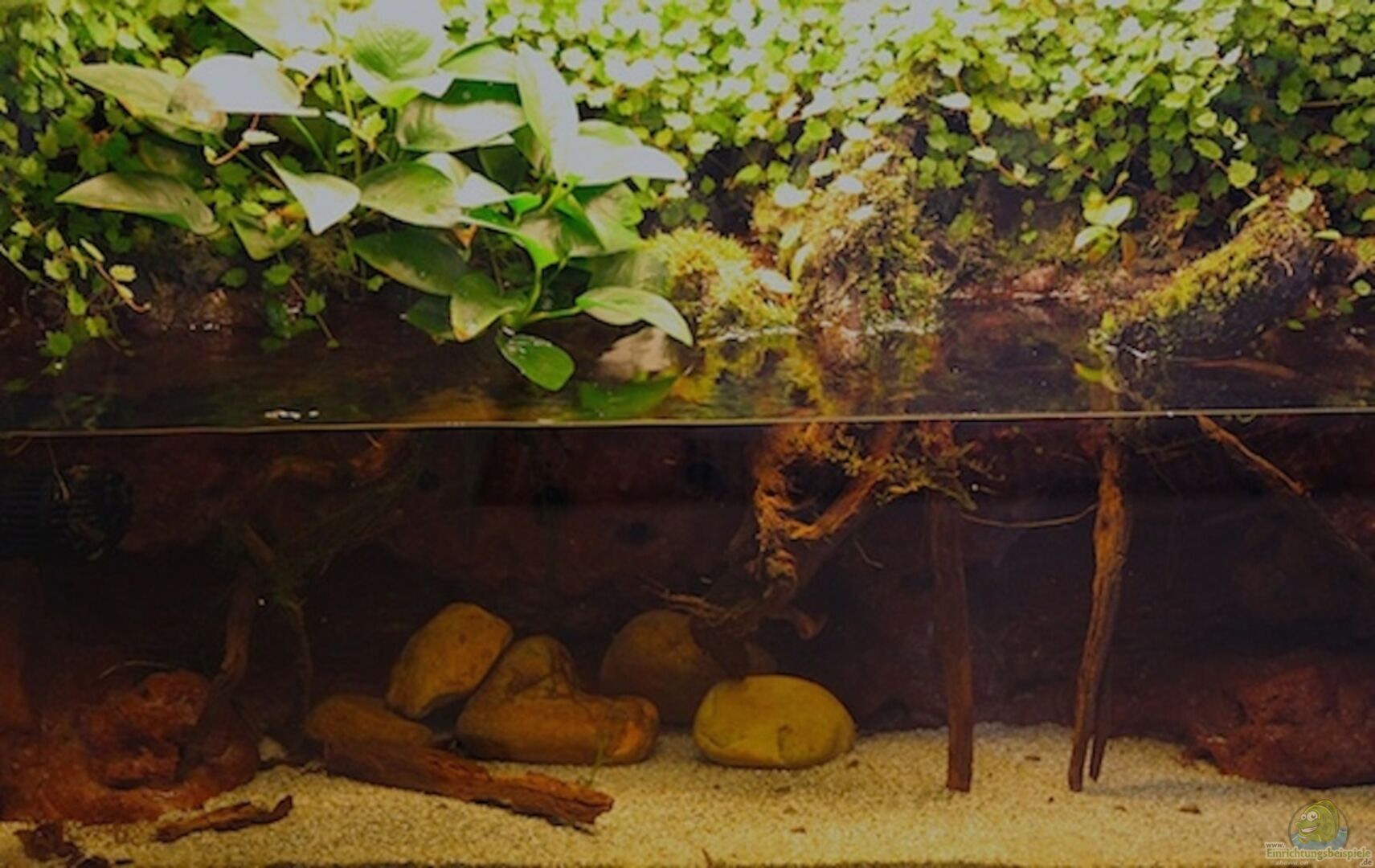Hier entsteht ein Vivarium/ Riparium mit einem Wasserteil von ca. 60 Liter. Es handelt sich um ein Standardbecken mit Abdeckung. Im Landteil sollen unterschiedlich feuchte Bereiche entstehen. Ein kleiner Wasserlauf/ Wasserfall soll in einer Wasserlache (max. 2cm tief) enden und der ??berlauf der Lache soll in den Wasserteil flie??en. Durch dichte Bepflanzung werden helle und schattige Bereiche entstehen. Zwischen Steinen, Wurzeln und Pflanzen werden zahlreiche Versteckmöglichkeiten zu finden sein. [...]