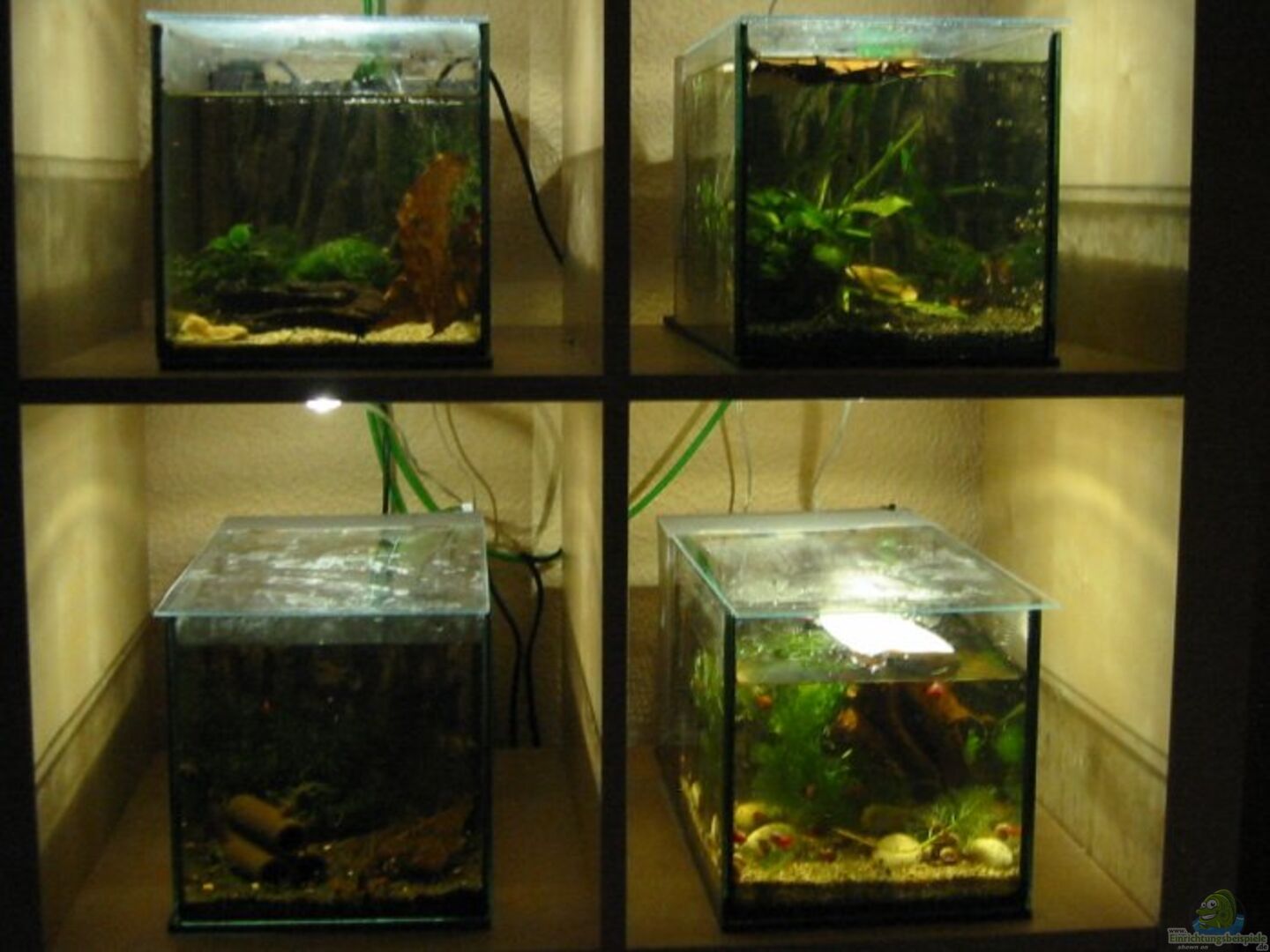 Alle Becken, die Deckel und die Filter sind Marke Eigenbau und von der Grö??e her auf das Ikea Expedit-Regal abgestimmt. Bei den Plexiglas-Abdeckungen bin ich ganz besonders Stolz über meine Idee. Das Lochblech ist genau so breit wie der Filter, so dass dort Luft rein aber keine Tiere raus können.(selbst Krebse hätten es wirklich schwer!) Das Lochblech ist am Aquarium festgemacht, mit kleinen Schanieren lässt sich so eine Abdeckung zum Füttern und reinigen anheben.