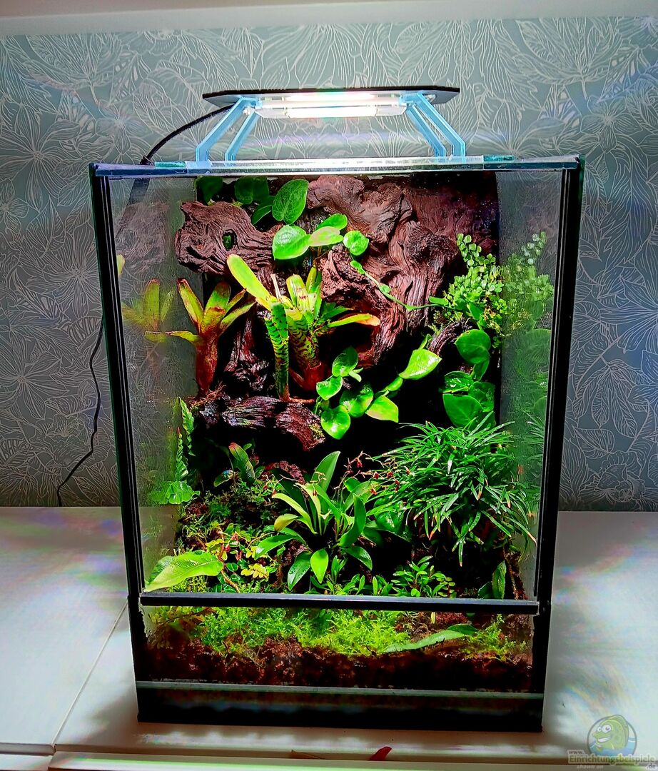 Falltürterrarium mit oben angebrachter Belüftungsgaze Die Rückwand ist mit Wurzelstücken aus Mopaniholz gestaltet. Sie wurden mit Aquariensilikon an der Rückwand festgeklebt.