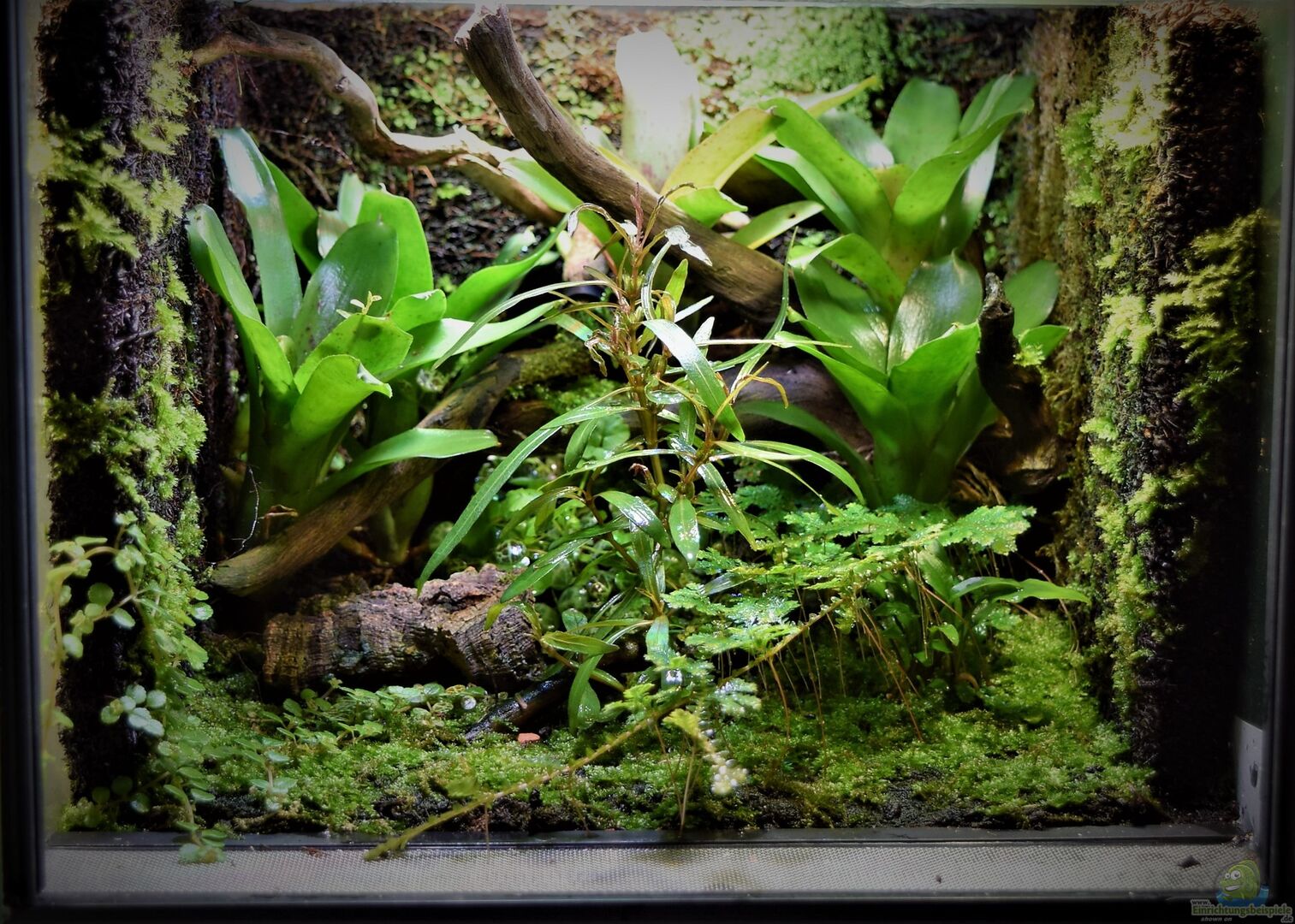 Terrariumswürfel mit feiner Gaze und einer sog. Falltür als ??ffnung. Die Wände sind mit Xaximplatten, die bereits in einem anderem Terrarium verbaut waren, verkleidet. Sie wurden mit Aquariensilikon an die Glaswand geklebt. Die Bemoosung findet sehr schnell statt, da nur die Feuchtikeit und das Licht gefehlt hat, um die Platten zu reaktivieren.