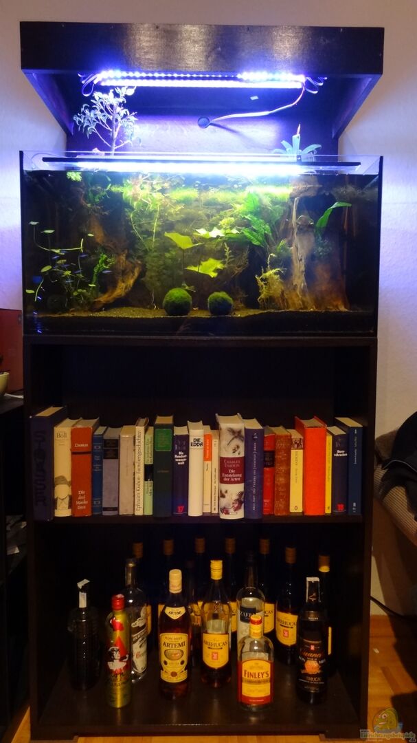 Der komplette Schrank ist von mir für dieses Aquarium massgefertigt. Er besteht aus 18mm starkem Multiplex Birke mit einer Lasur (Palisander) auf Wasserbasis. In dem über das Becken ragenden Vorsprung befindet sich eine rechteckige Aussparung auf der ein herausnehmbares Holzbrett liegt. Hier sind die RGB-LEDs angebracht. Im Fach unterhalb des Aquariums (hinter den Büchern) sind die Lichttechnik und der Filter untergebracht. Hierfür werden die Schläuche und Kabel durch Bohrungen [...]